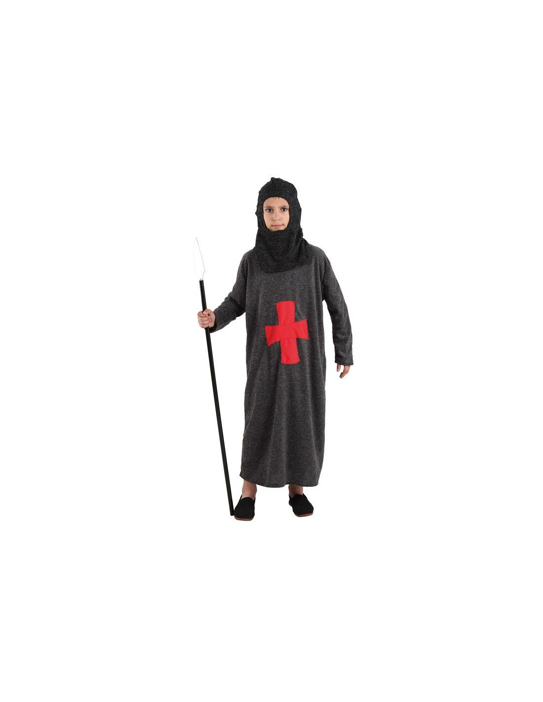 Disfraz de cruzado para niño ideal para ferias medievales o representaciones teatrales de fin de curso. Incluye un disfraz de cruzado medieval para niño, fabricado en tejido de lana, y compuesto por una túnica con la cruz roja de los cruzados o templarios, y una capucha cubrehombros imitación a la cota de malla que se lleva en la Edad Media. ¡A por la Reconquista!