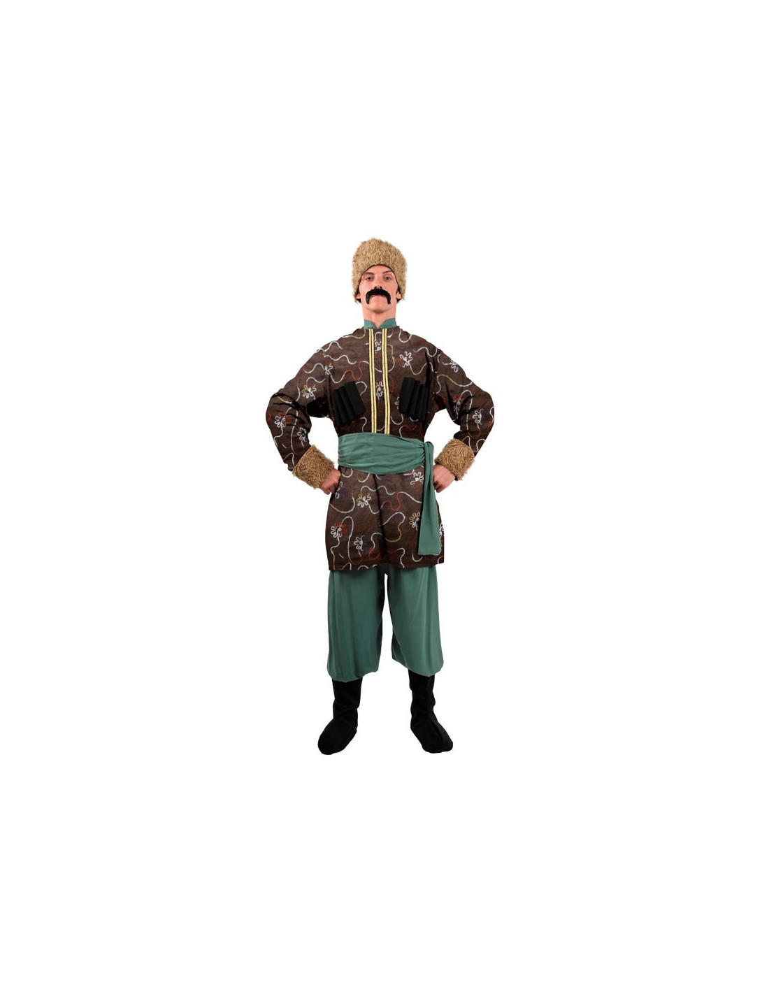 Disfraz de cosaco para afrontar los duros inviernos de Rusia. Incluye chaqueta estampada y pantalón bombacho liso, cinturón, gorro de pelo y cubrebotas.