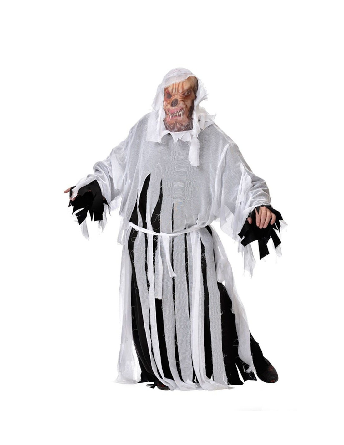 Disfraz de Licantropo compuesto por tunica negra de strech, casaca de gasa blanca con desgarros y mascara con la estampación de un hombre lobo con capucha
