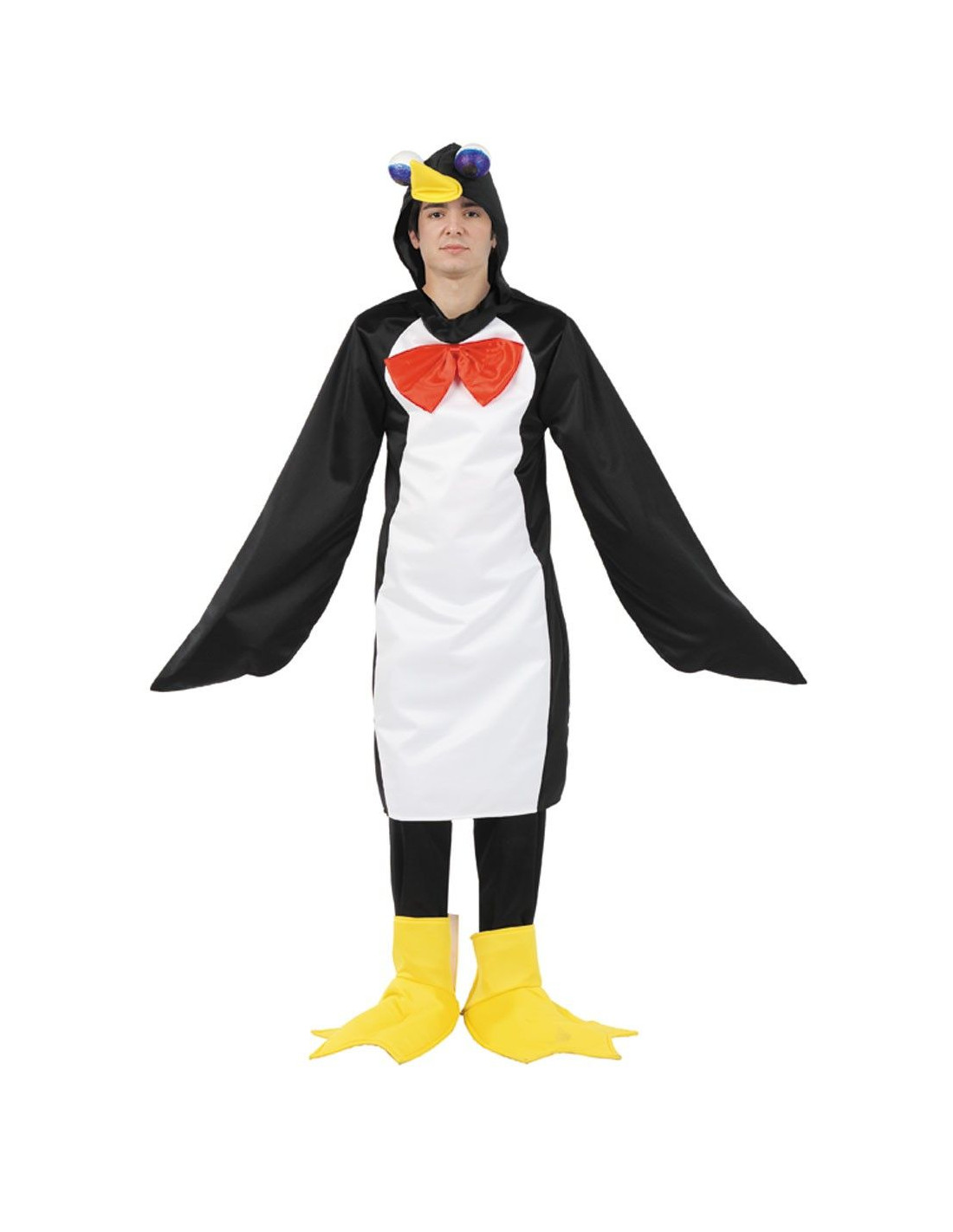 Báñate entre orcas y tiburones con este fantástico disfraz de pingüino para adulto ideal para tu fiesta de Carnaval. Incluye un original disfraz de pingüino para adulto, compuesto por un vestido enterizo con cabeza, pajarita roja, pantalón negro y cubrebotas amarillo simulando las patas del animal.