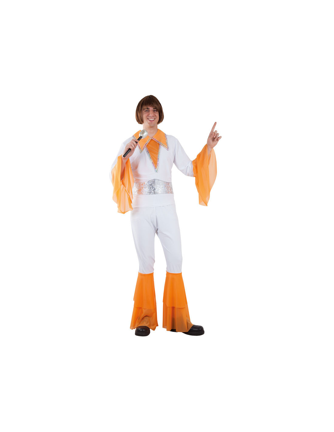 Disfraz de Abba para hombre que incluye camisa y pantalón de tejido elástico con adornos en color naranja y cinturón a juego.