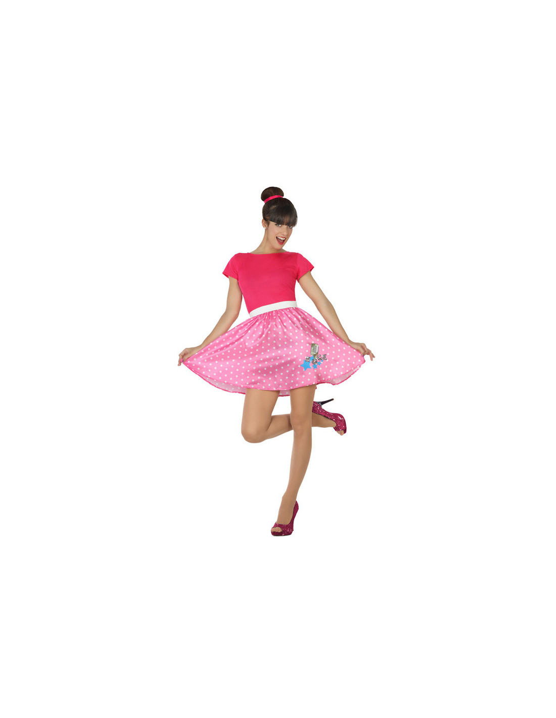 Disfraz años 50 rosa para mujer que incluye vestido con camiseta rosa y falda con lunares.