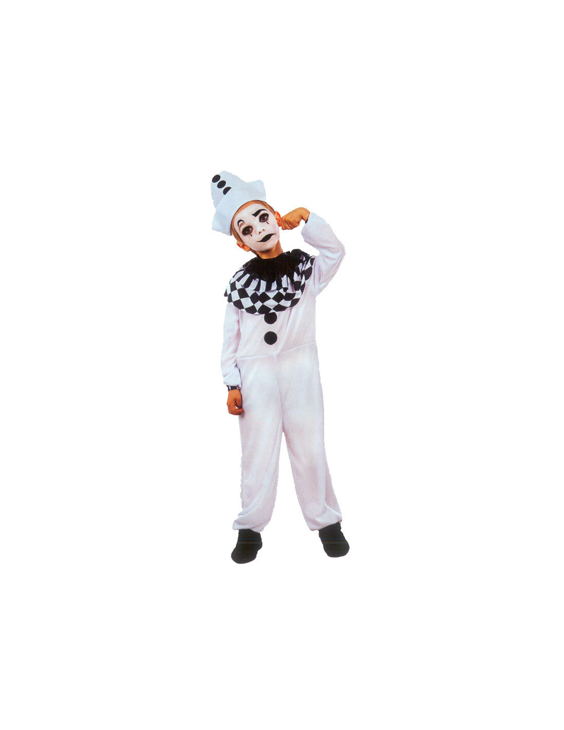 Bonito disfraz arlequín blanco niño para carnaval y festivales Fin de Curso. Además también puedes usarlo para halloween realizando un maquillaje terrorífico.