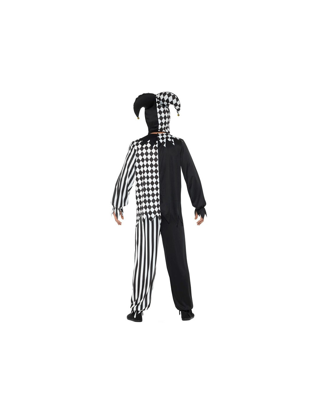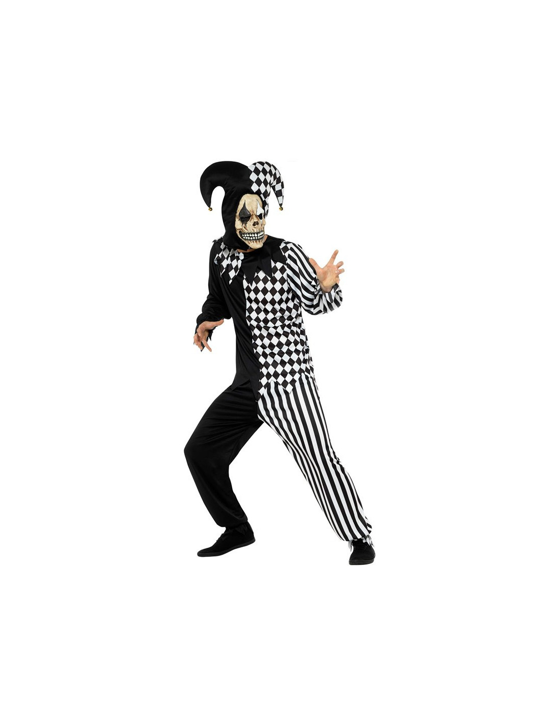 Disfraz arlequín malvado adulto que incluye túnica, pantalones, sombrero con cascabeles y máscara de látex.