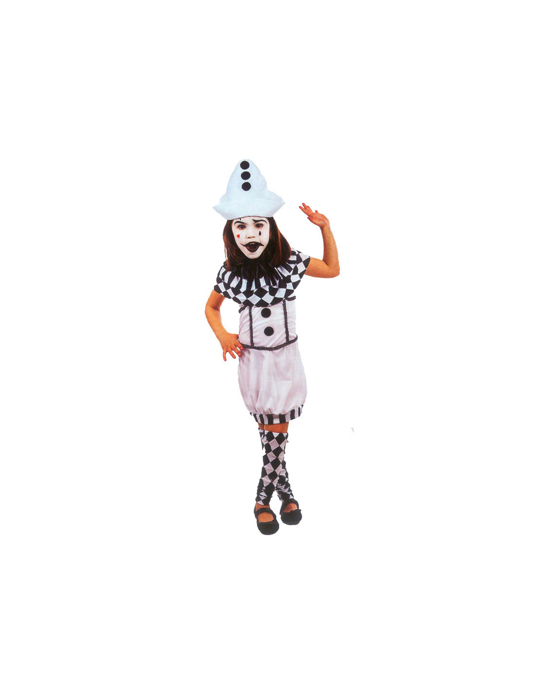 Disfraz arlequina blanca niña que incluye vestido, collarín, sombrero y calentadores.