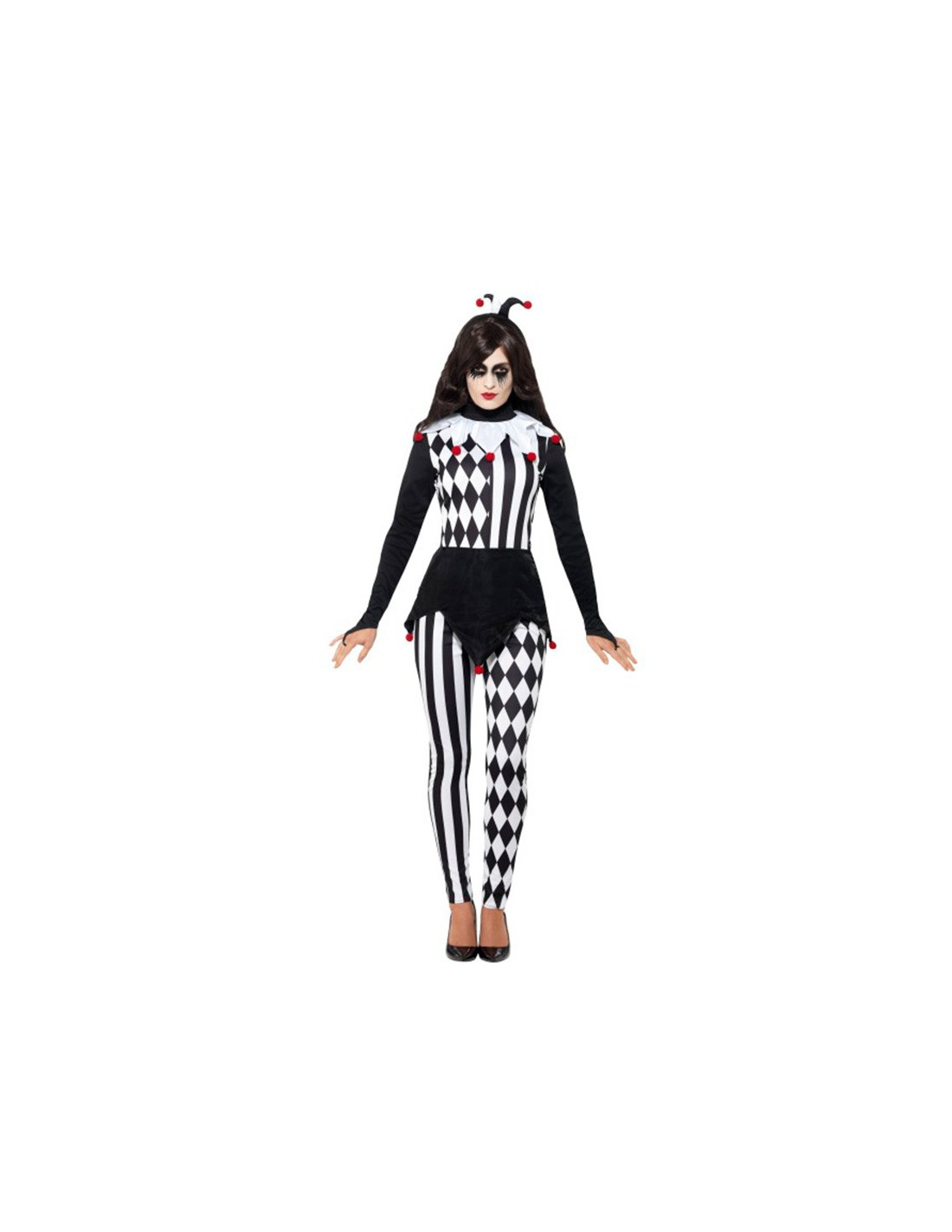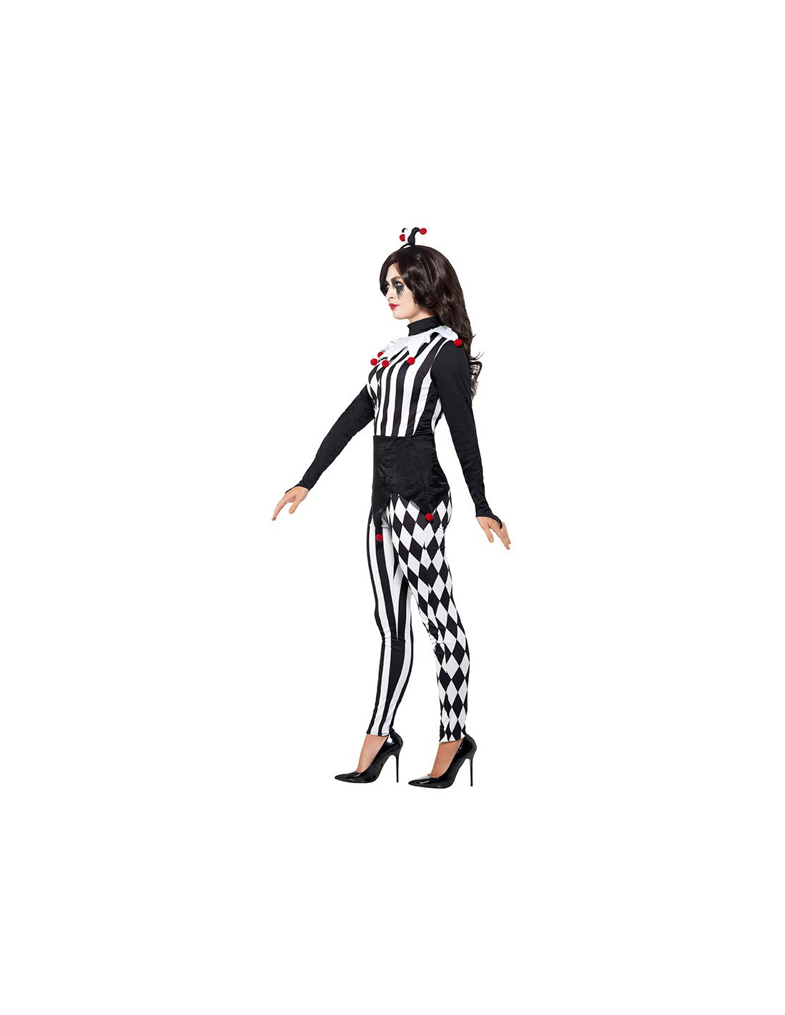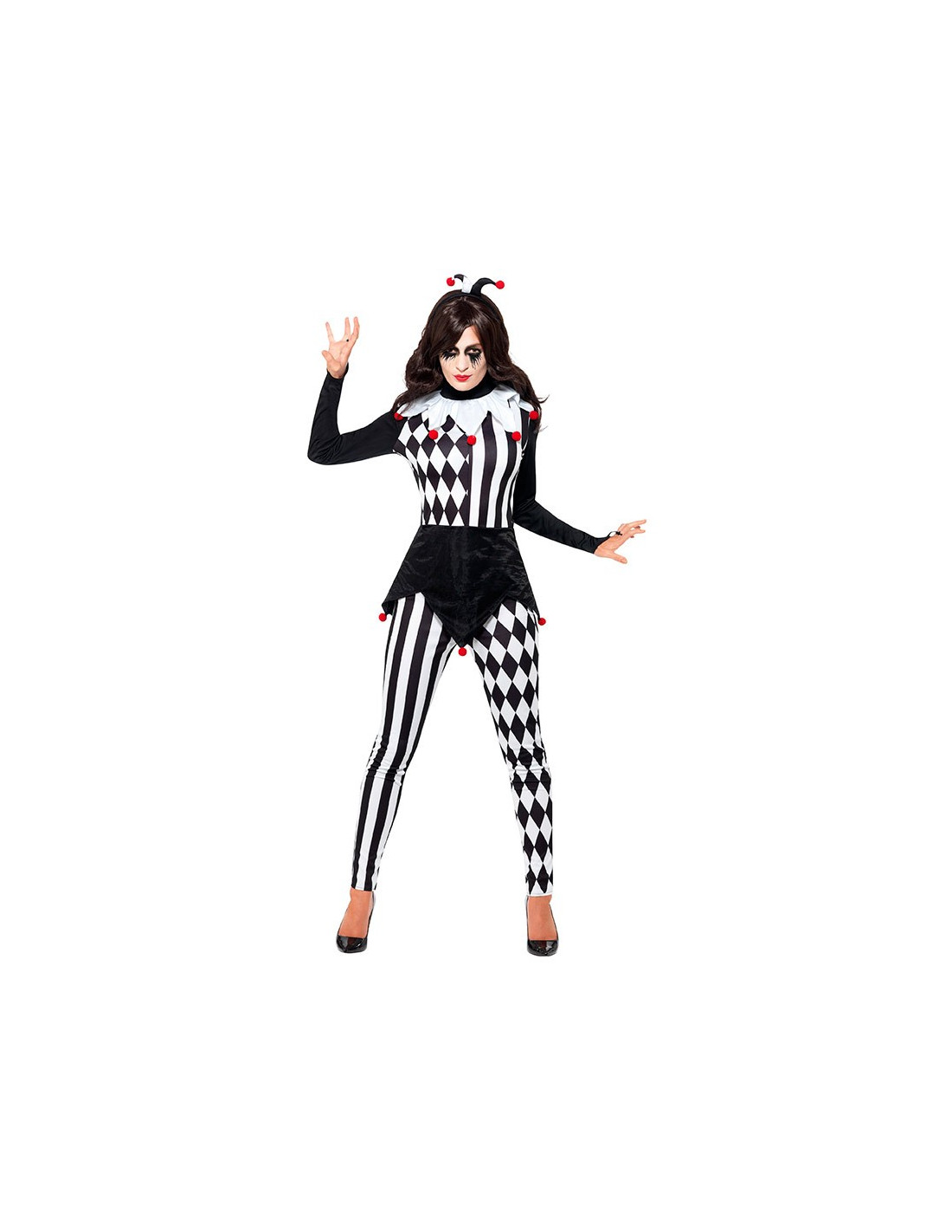 Disfraz arlequina mujer compuesto por una camiseta, falda con leggins y una diadema con corona para la cabeza, todo ello en color blanco y negro.