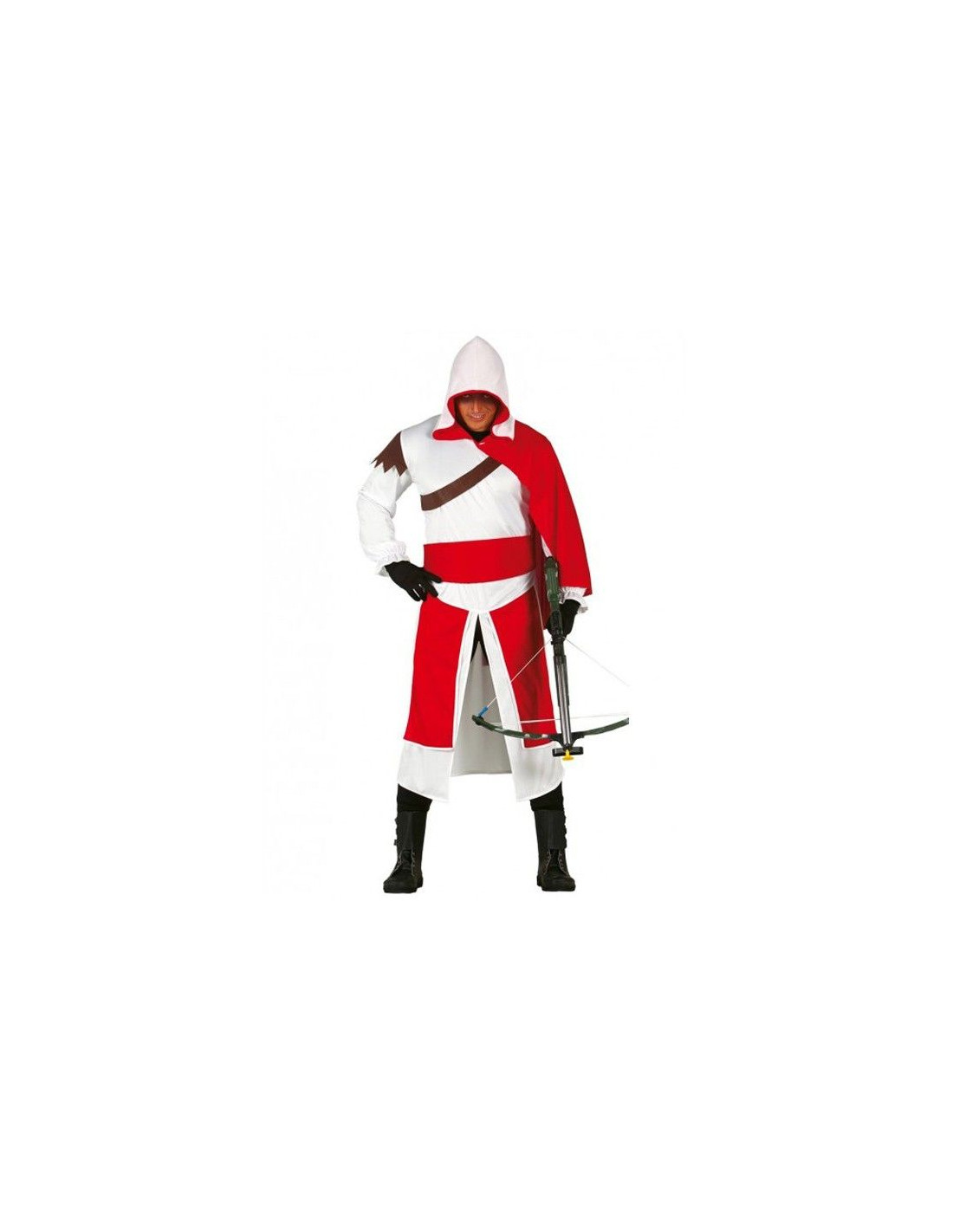 Disfraz Assassins Creed hombre que incluye tunica blanca con capucha, la tunica tiene detalles rojos en las piernas, detalle de polipiel marron en el hombro, capa roja lateral y la capucha esta forrada con tejido rojo, ademas incluye cinturon de tejido foamizado rojo y tira de polipiel marron para el pecho.