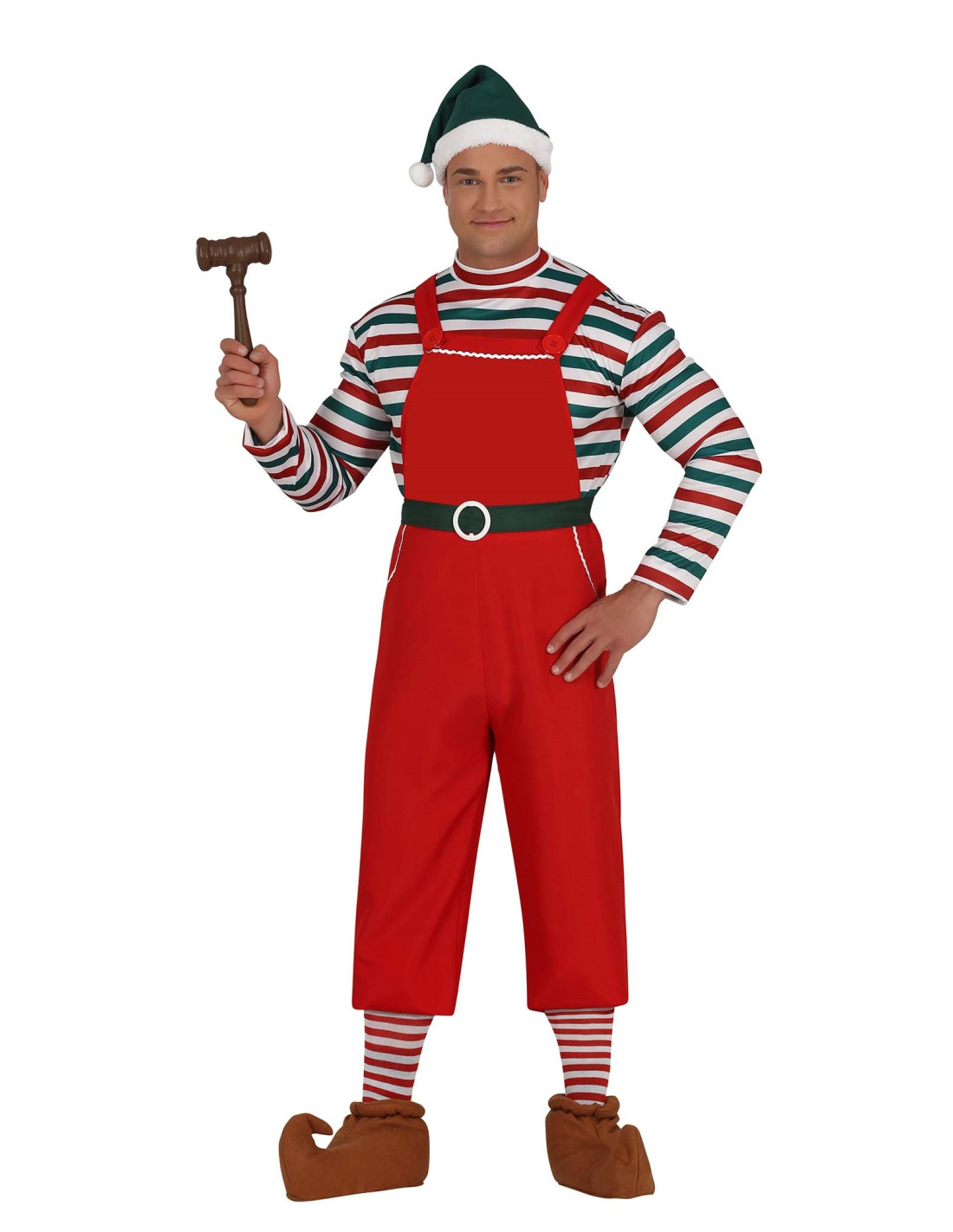 Disfraz ayudante de Santa adulto que incluye sombrero, cinturón, camiseta y peto.