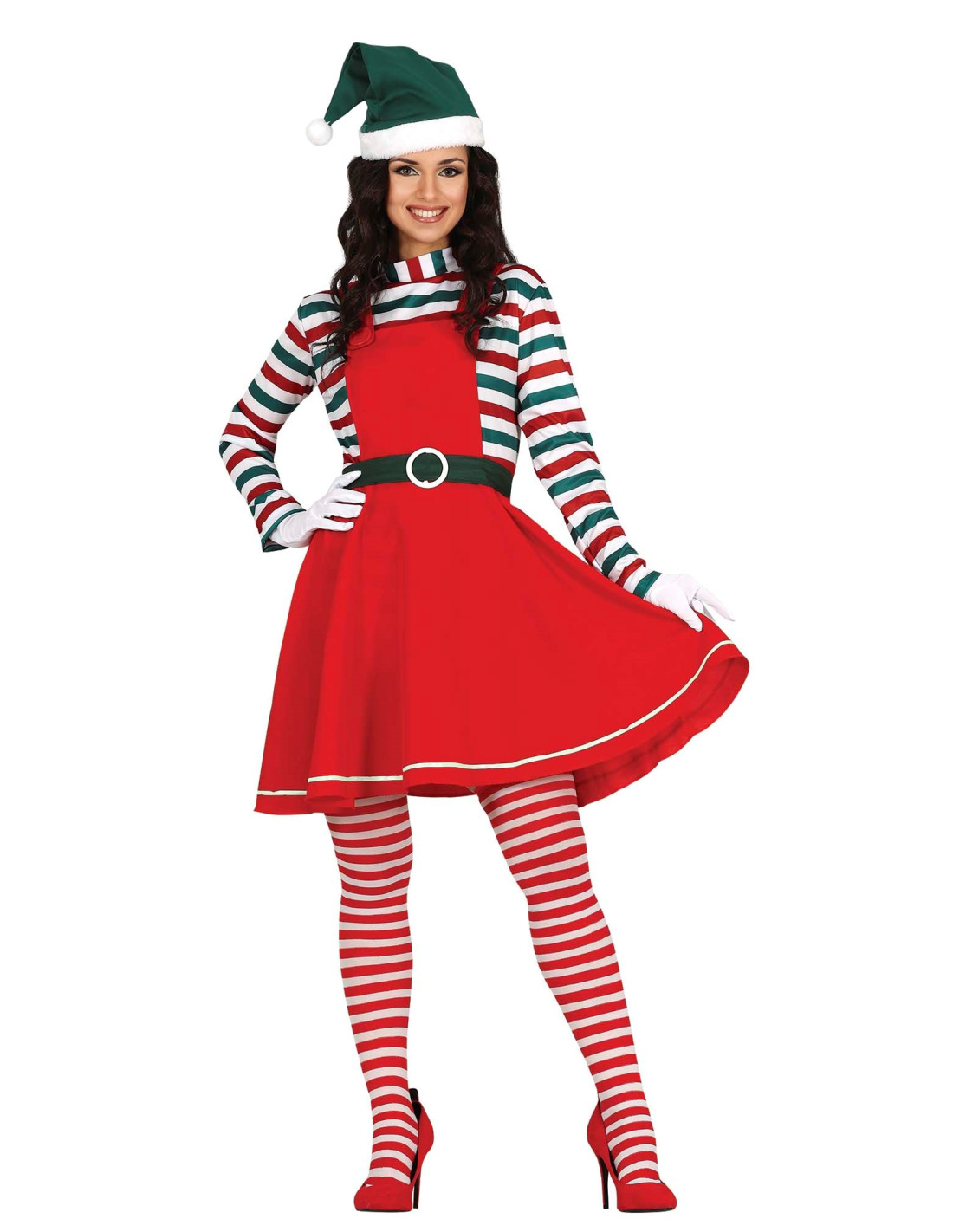 Disfraz ayudante de Santa mujer que incluye gorro, camiseta, vestido y cinturón.