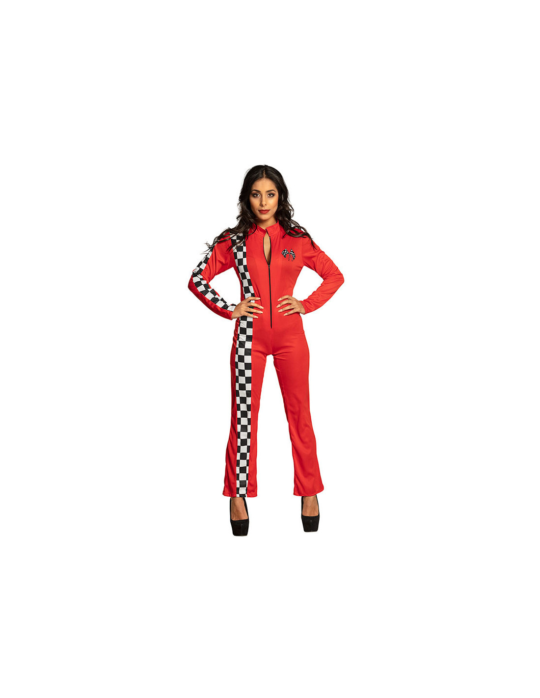 El disfraz azafata de carreras mujer contiene un mono rojo de cuerpo entero con cremallera en la parte frontal.