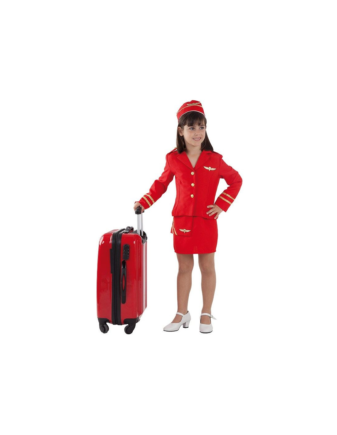 Disfraz de azafata de vuelo con el que tu niña dará todas las indicaciones a los pasajeros y no parará de viajar. Ideal para fiestas temáticas y Carnaval. Incluye gorro, chaqueta y falda con delantal.