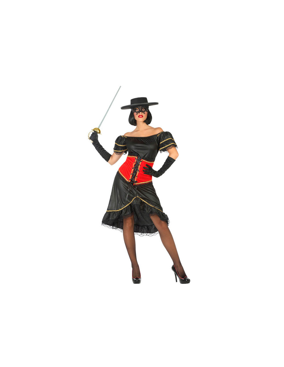 El disfraz bandida para mujer contiene un bonito vestido negro con escote de barco y una especie de corsé en la cintura. La falda del vestido es desigual de forma que es más corta por delante que por detrás y tiene una terminación en puntilla.