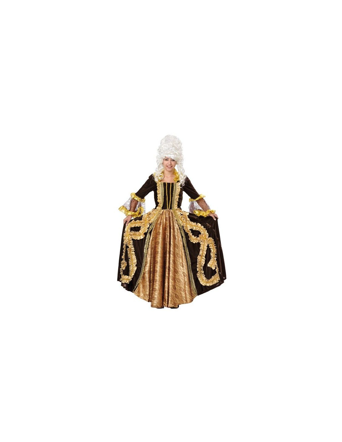 Disfraz Baronesa, que incluye: Vestido en terciopelo marron adornado con pasamaneria oro y el delantero de la falda es de color oro con blonda.