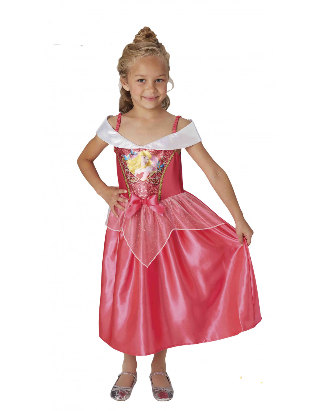 Disfraz Bella Durmiente para niña que incluye vestido con lentejuelas, pecho estampado y lazo.
