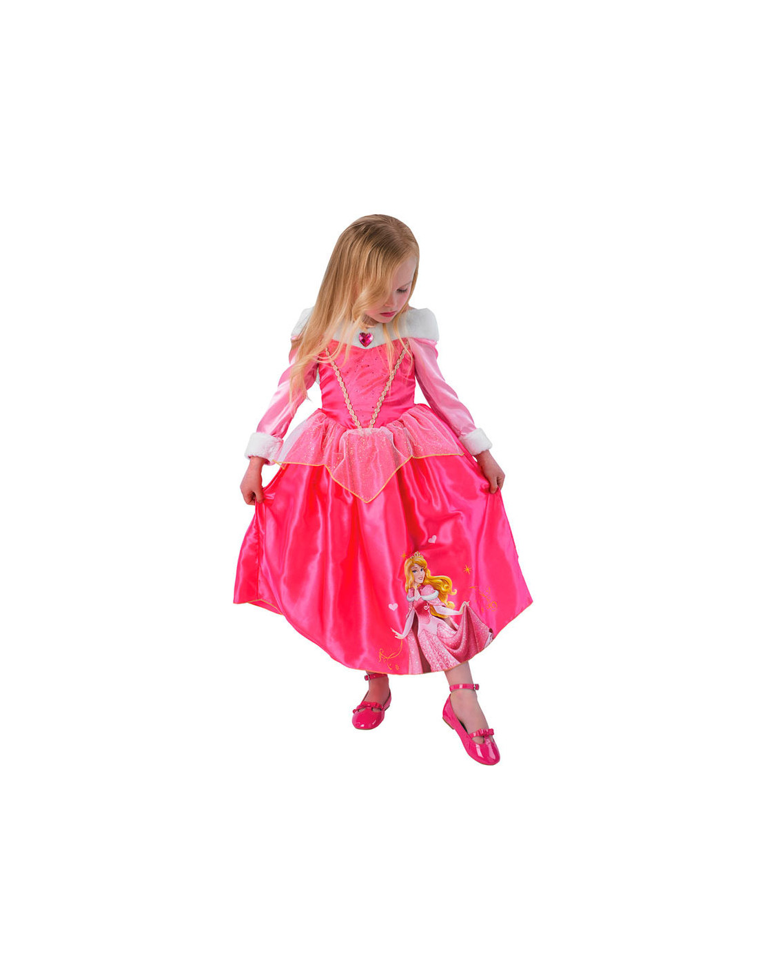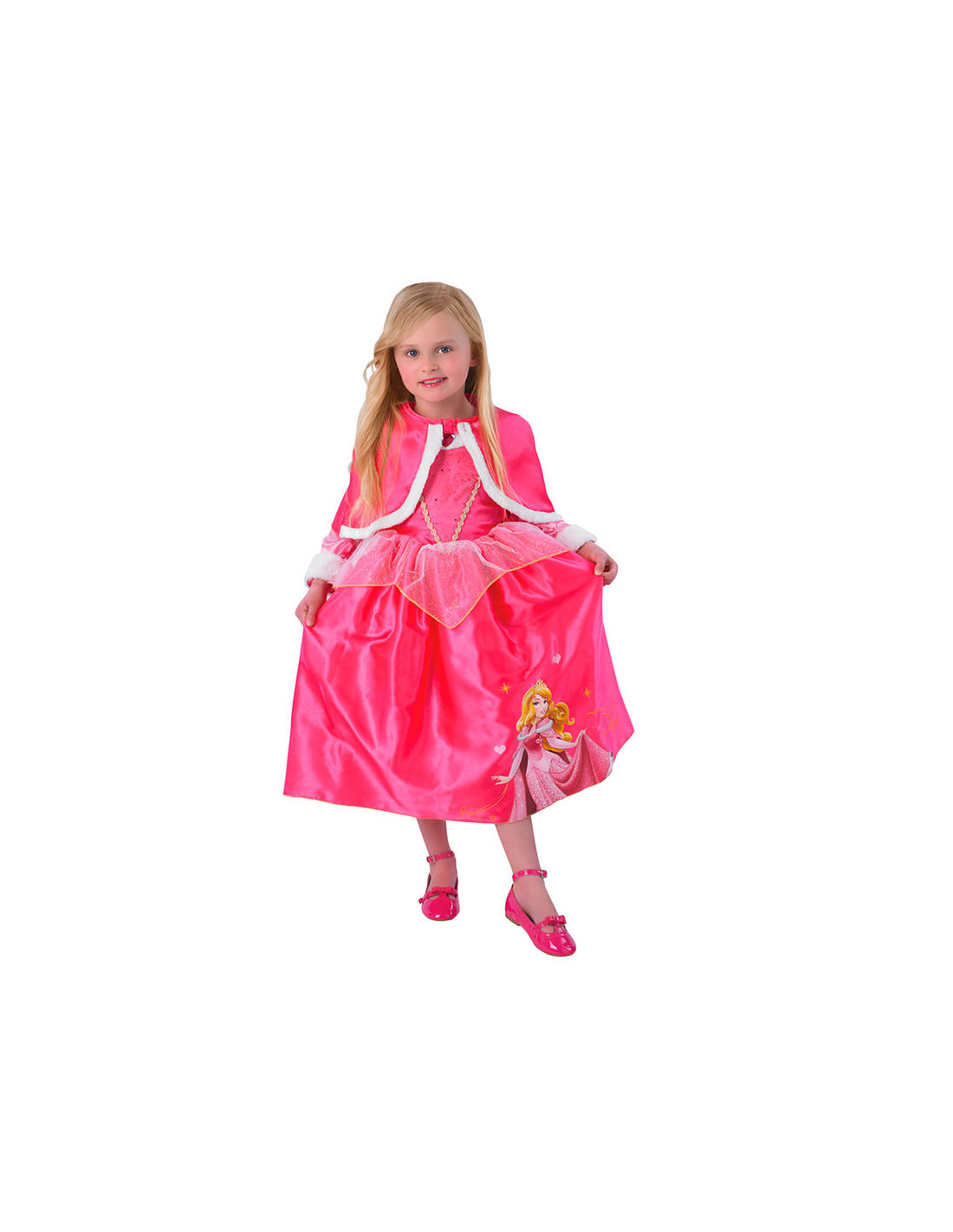El disfraz Bella Durmiente Winter niña contiene vestido rosa con la imagen de la princesa en la falda y capa.