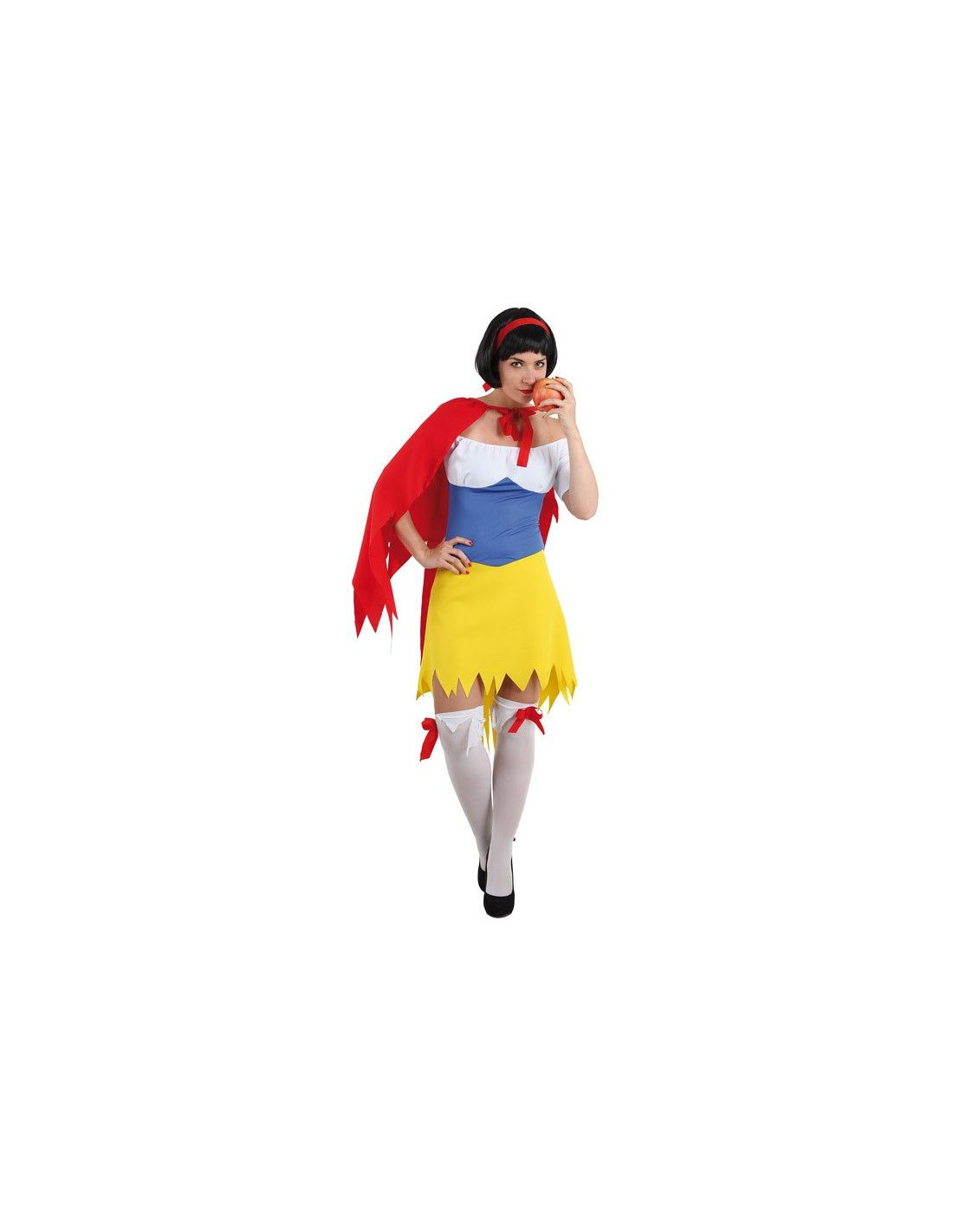 Disfraz Blancanieves Halloween, que incluye: Vestido elástico con la falda a picos, capa roja a picos y medias blancas con lazos rojos.