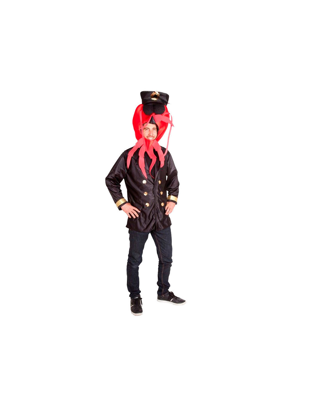 Disfraz bogavante elegante adulto que consta de una chaqueta negra en tejido de satín decorada con adornos dorados, una cabeza confeccionada con tejido de foam rojo y una gorra negra.