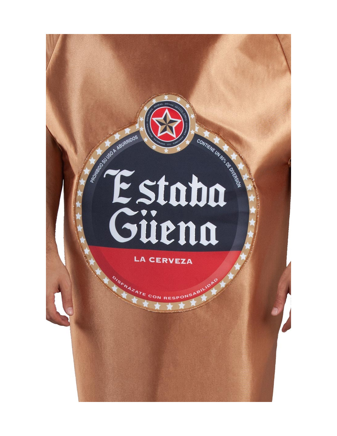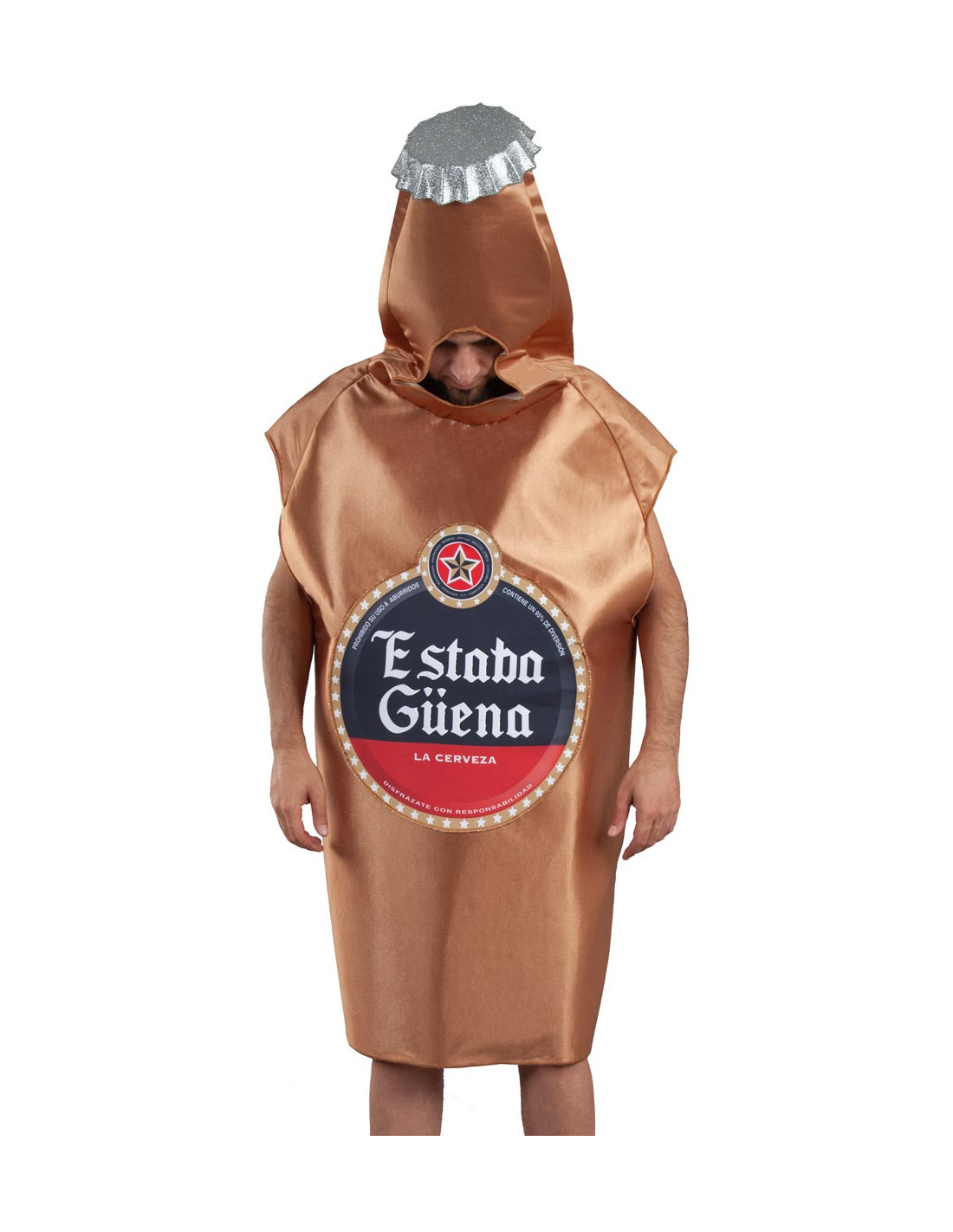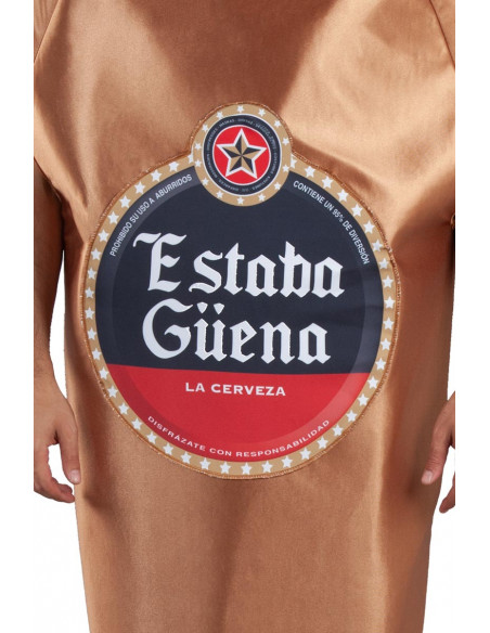 El disfraz botellín cerveza adulto contiene el cuerpo de la botella con etiqueta "Estaba Güena" y una chapa de color plata de goma eva. La botella tiene un tamaño aproximado de 145x71cm.