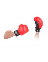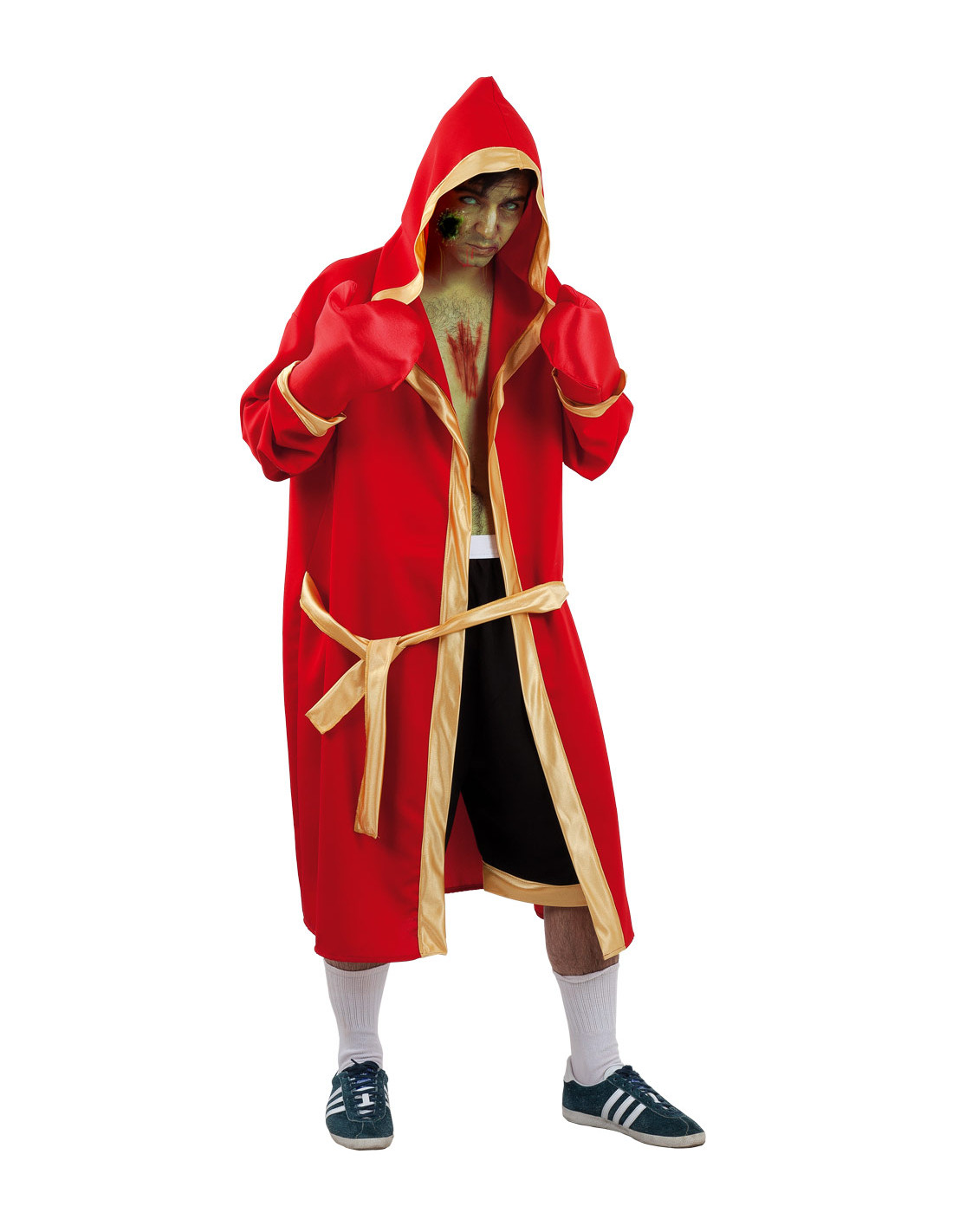 Disfraz boxeador para hombre que incluye bata con capucha roja decorada con tejido color oro en el delantero, puños y el cinturon, calzones negros con goma blanca ancha y guantes fabrciados en ftejido foamizado rojo.