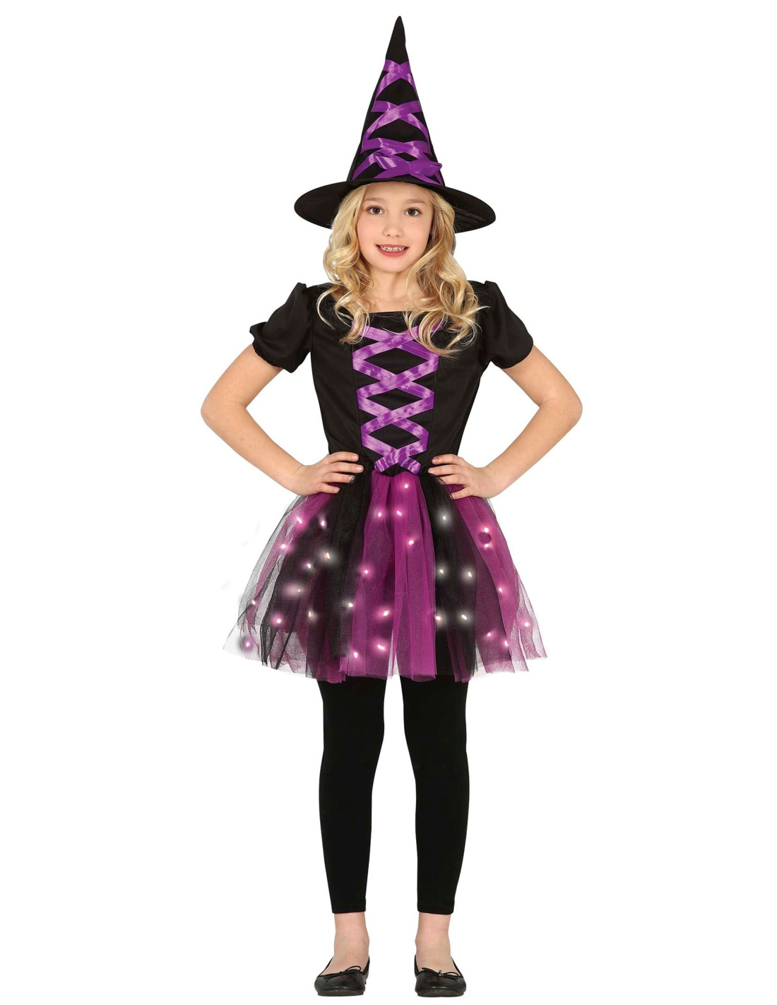 Disfraz bruja con luces para niña que incluye sombrero, vestido con LEDs en la falda.