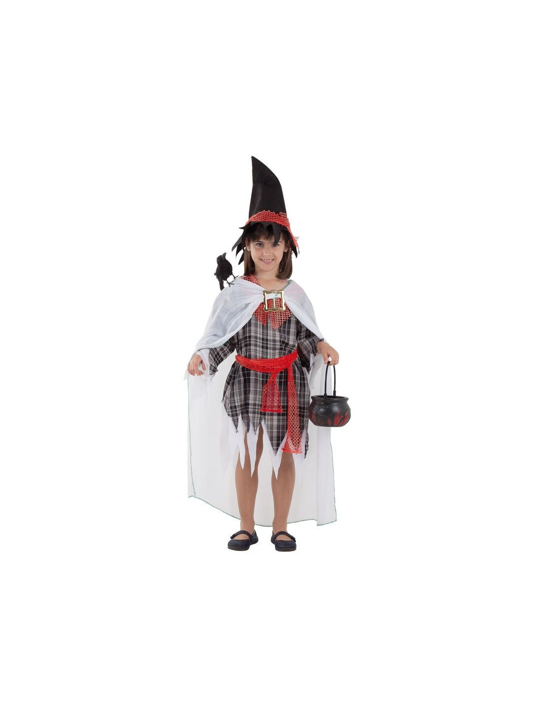 El disfraz de bruja niña incluye el vestido en tejido de popelin estampado a cuadros grandes por fuera y pequeños por dentro, capa de gasa con hebilla metálica, malla naranja en cuello y mangas y gorro de fieltro decorado en combinación con el traje. Económico disfraz de bruja malvada con el que convertirás a tu hija en una pícara hechicera. Ideal para Halloween o para los eventos de carnaval.