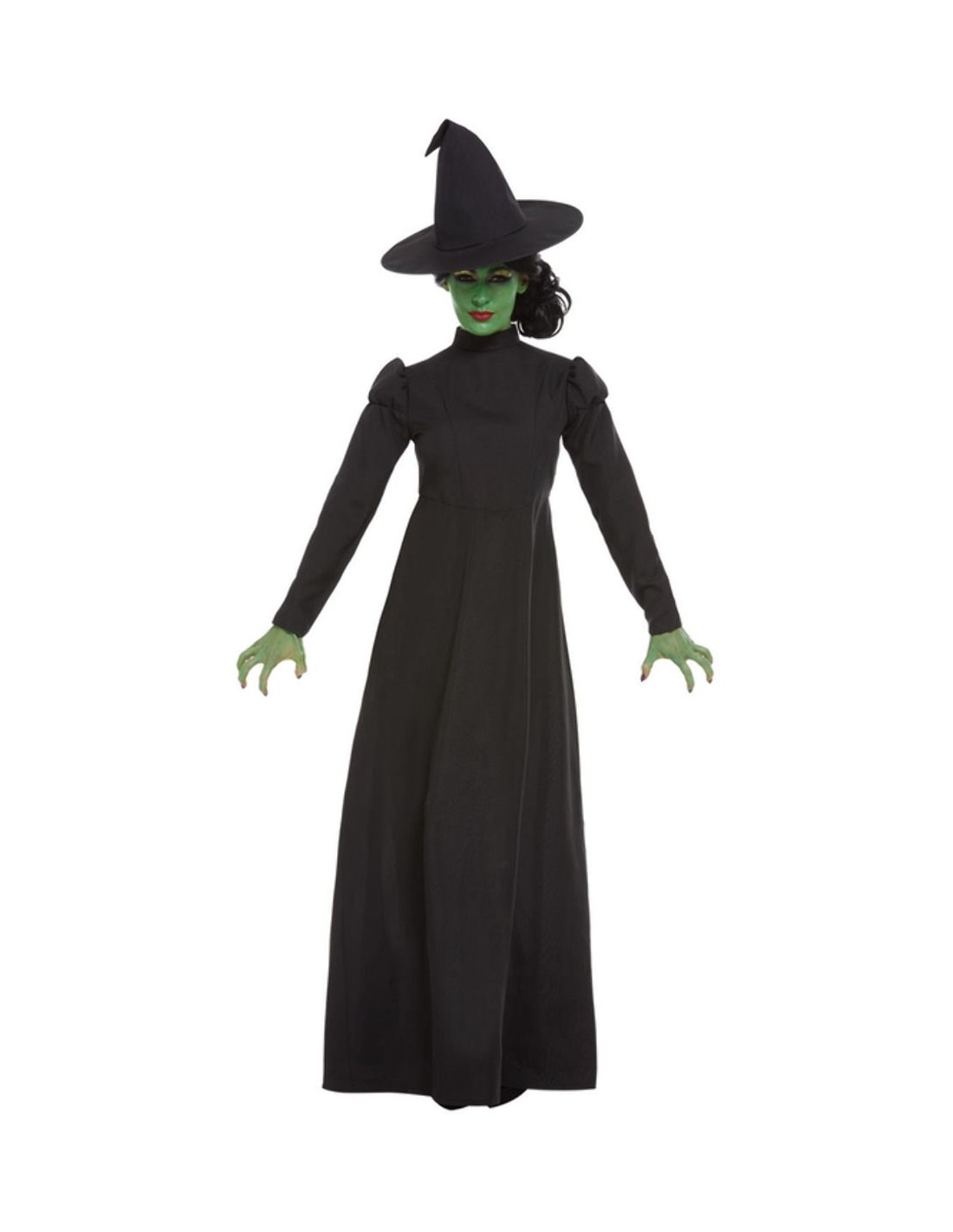 Disfraz bruja negra clásica mujer que incluye vestido largo de manga larga y sombrero.