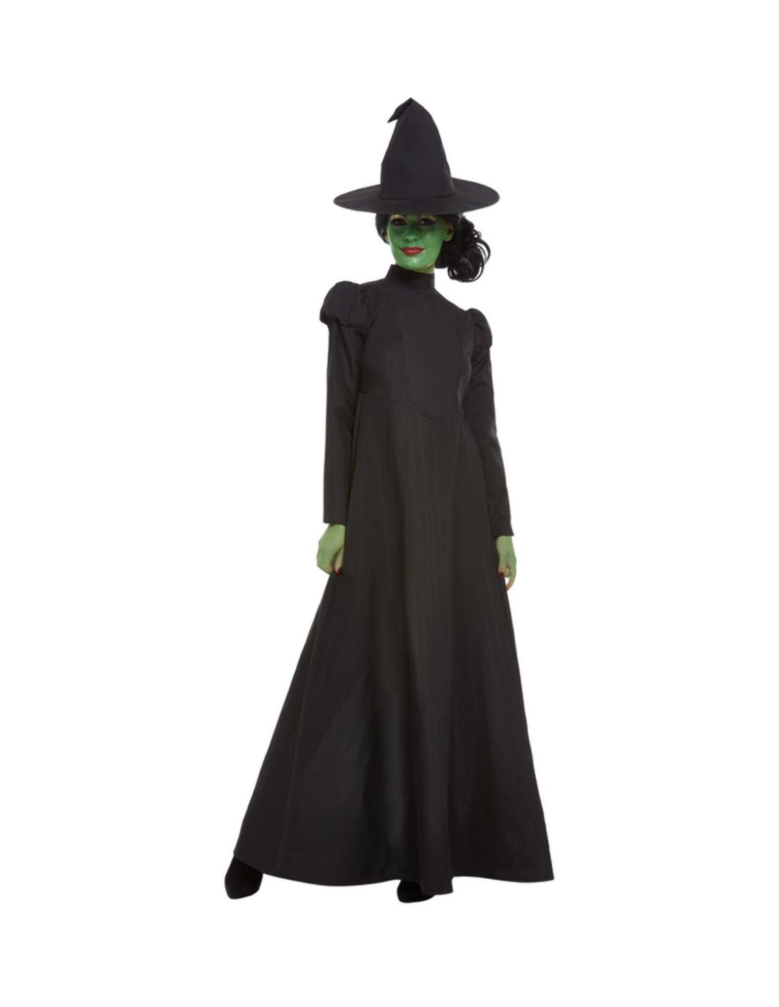 El disfraz bruja negra clásica mujer contiene un vestido negro con falda larga y manga larga, y un sombrero negro a juego.