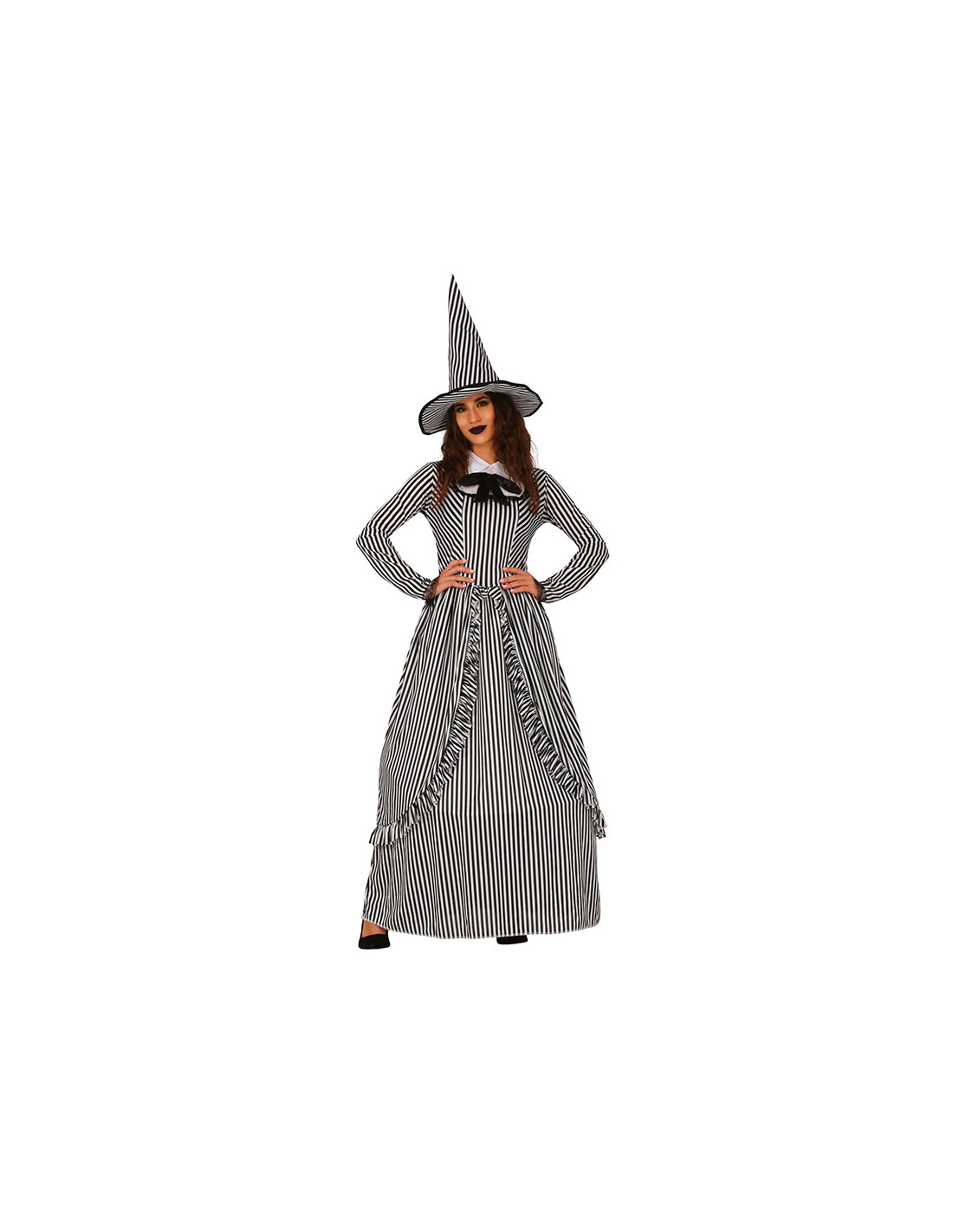 El disfraz de bruja clásica contiene un elegante vestido largo blanco y negro con un toque clásico y un sombrero a juego.