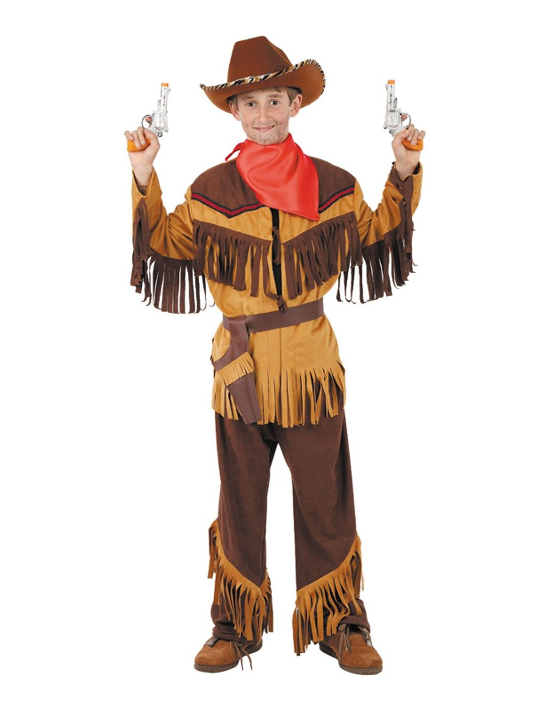 El traje incluye pañuelo, casaca, cinturón-cartuchera y pantalón. Con este traje puedes jugar a indios y vaqueros realizando aventuras en el lejano oeste americano tu puedes ser un famoso comboy.