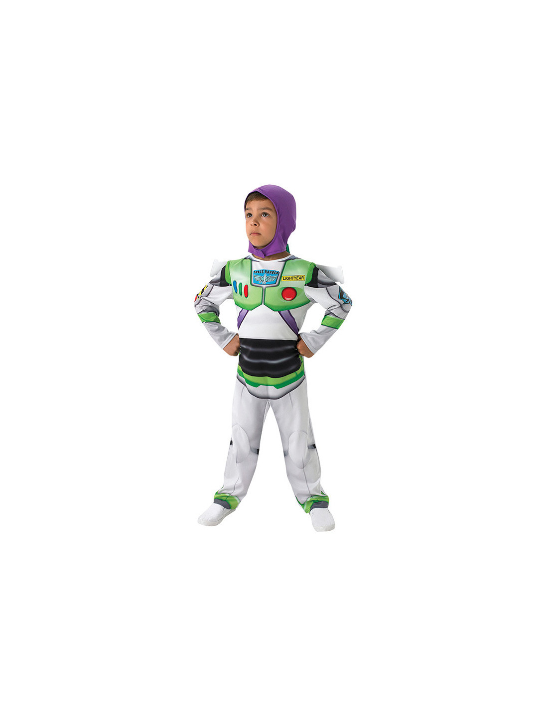 El disfraz Buzz Lightyear para niño contiene un mono de cuerpo entero estampado que simula un traje de astronauta y alas. Además incluye una capucha de color violeta