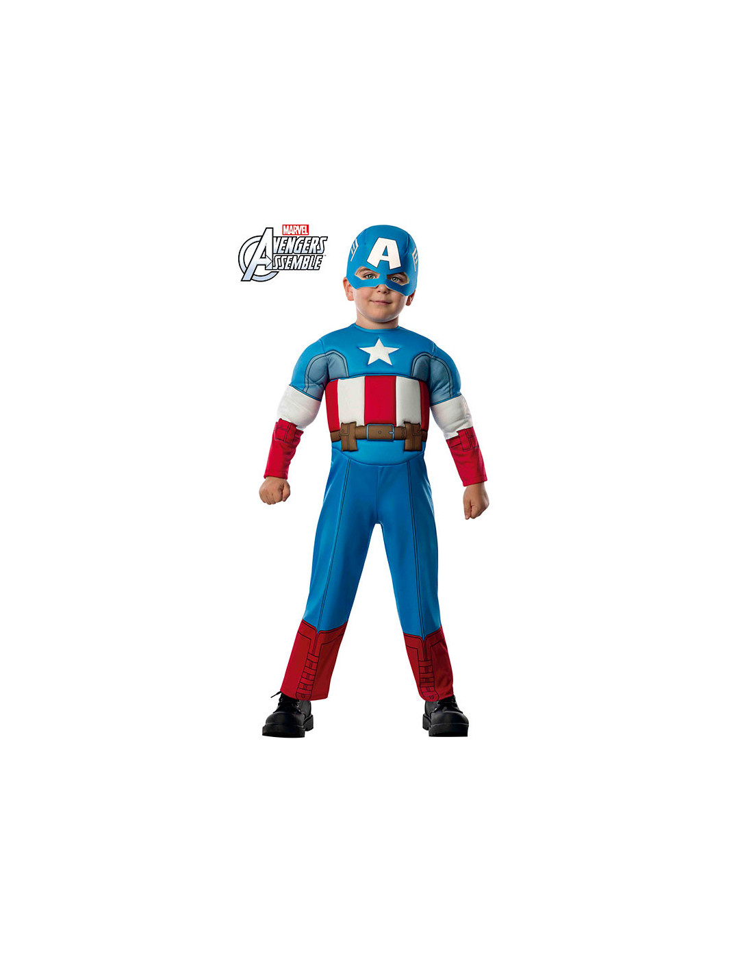 Este completo disfraz Capitán América bebé contiene un mono estampado y acolchado con máscara de goma eva.