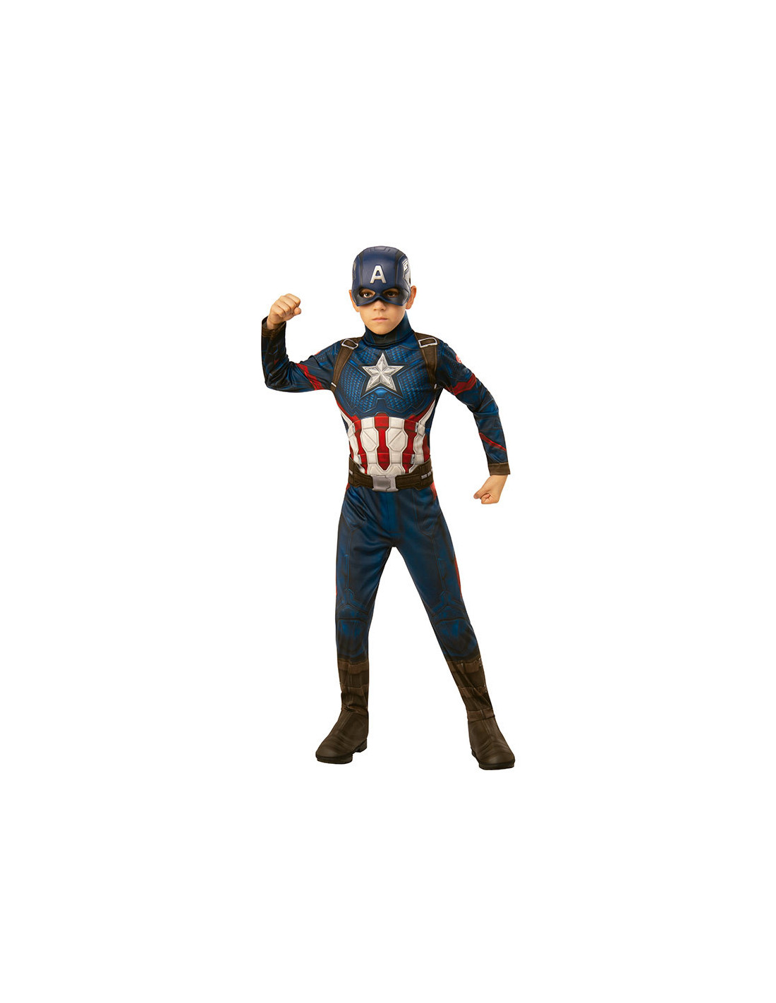 Disfraz Capitán América niño Endgame que incluye mono estampado con cubrebotas, cinturón y máscara.