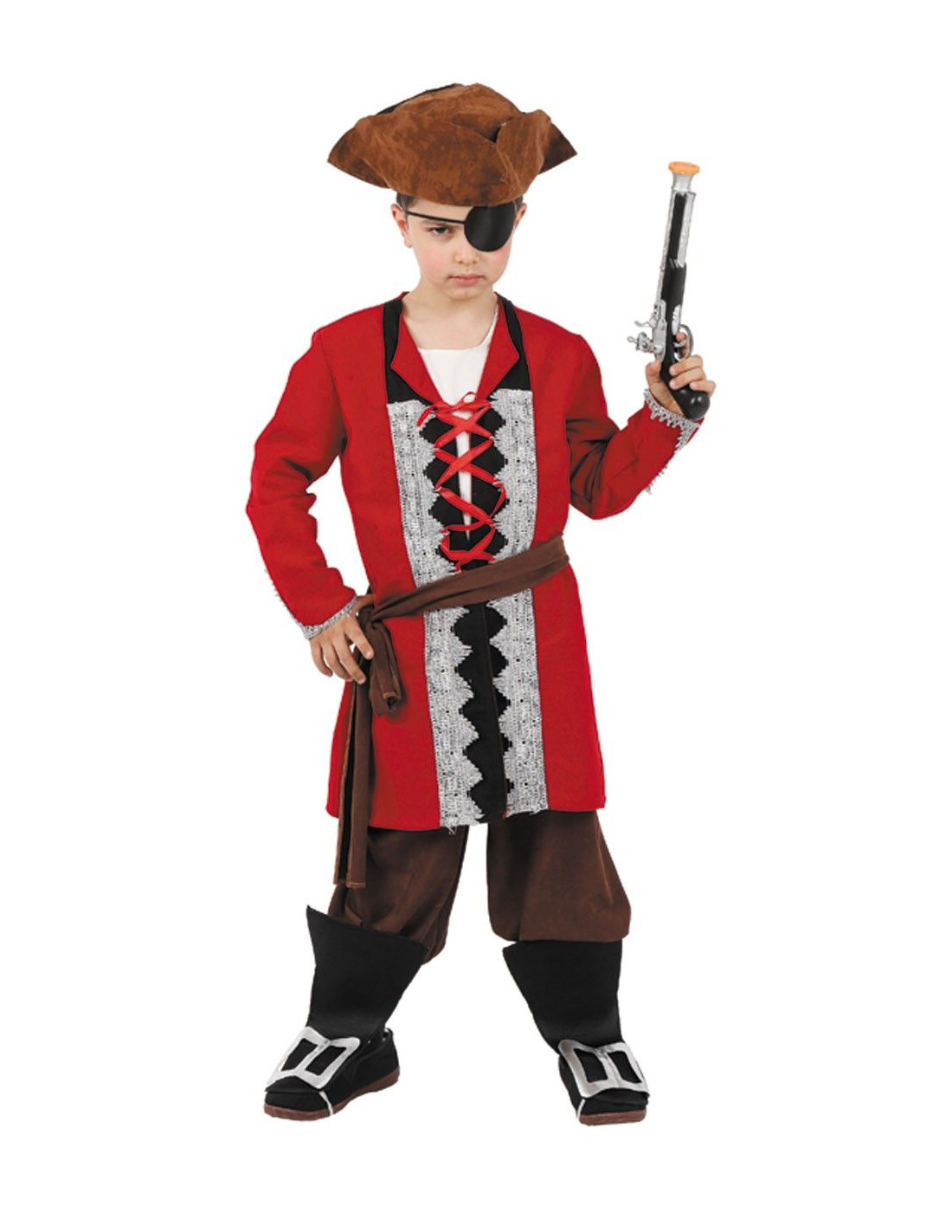 Disfraz capitán pirata niño que incluye gorro, casaca, cinturón, pantalón y cubrebotas.