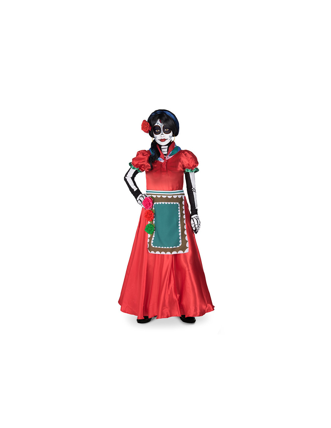 Disfraz Catrina Rosabella para niña que incluye camiseta esqueleto de manga larga, guantes esqueleto, vestido, delantal, pañuelo para el cuello, peluca, tattoo y esponja con pastilla blanca. ¡Lo incluye todo!