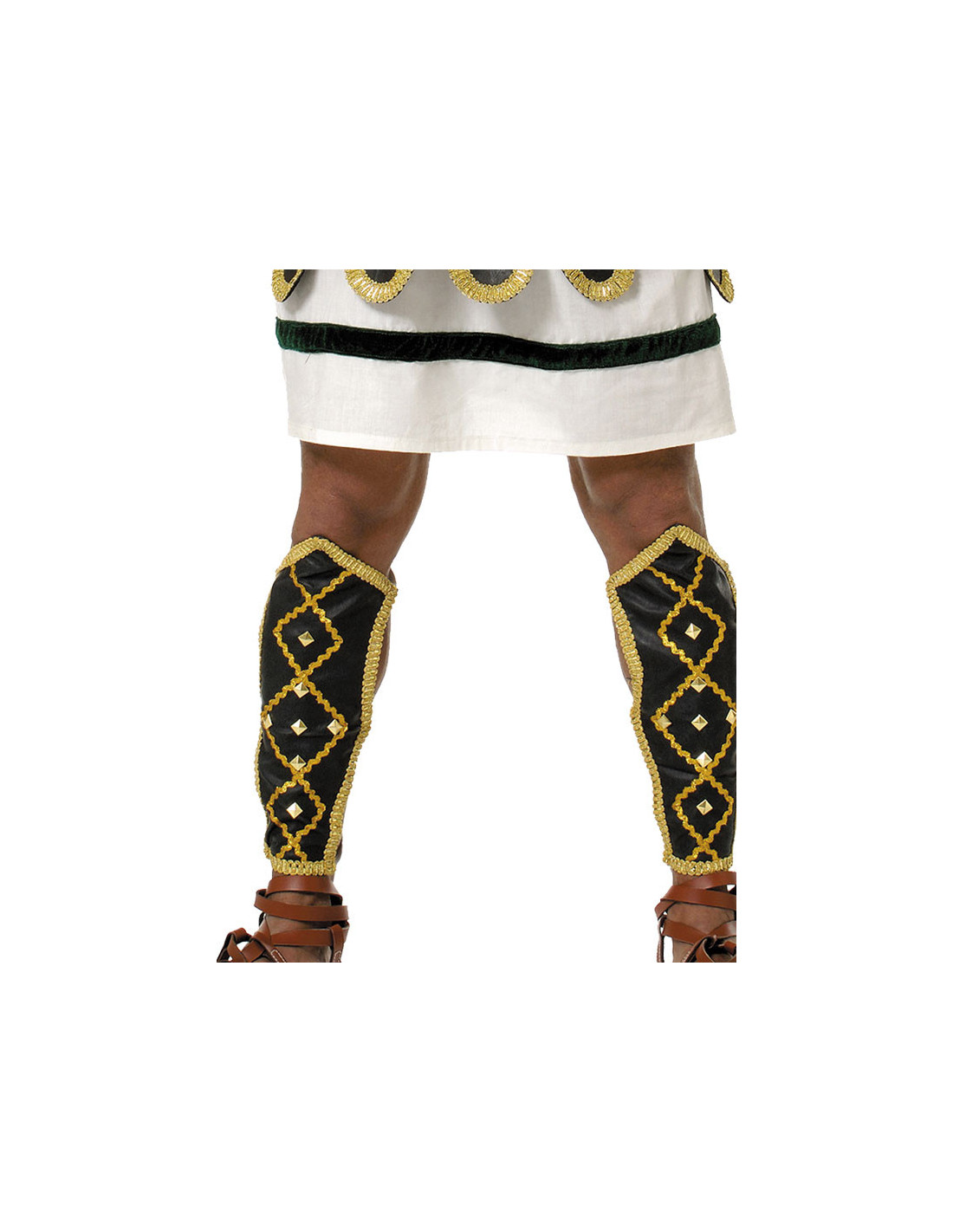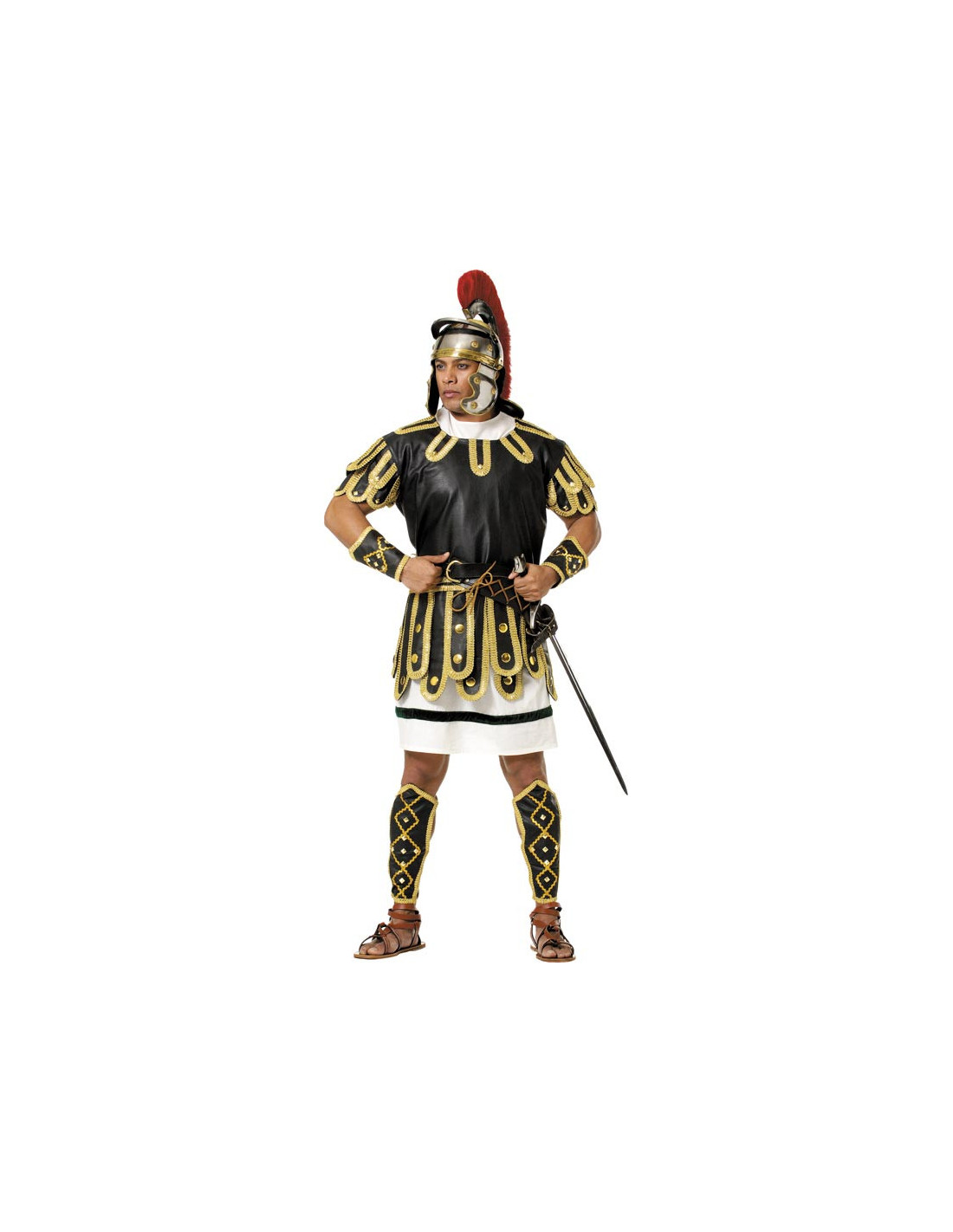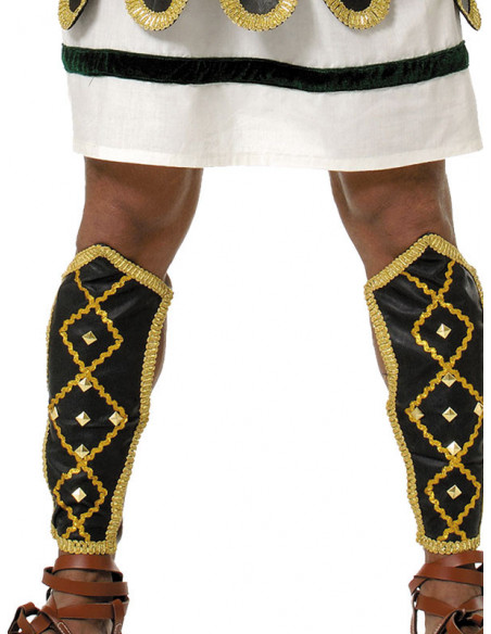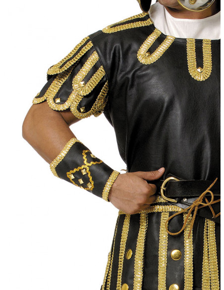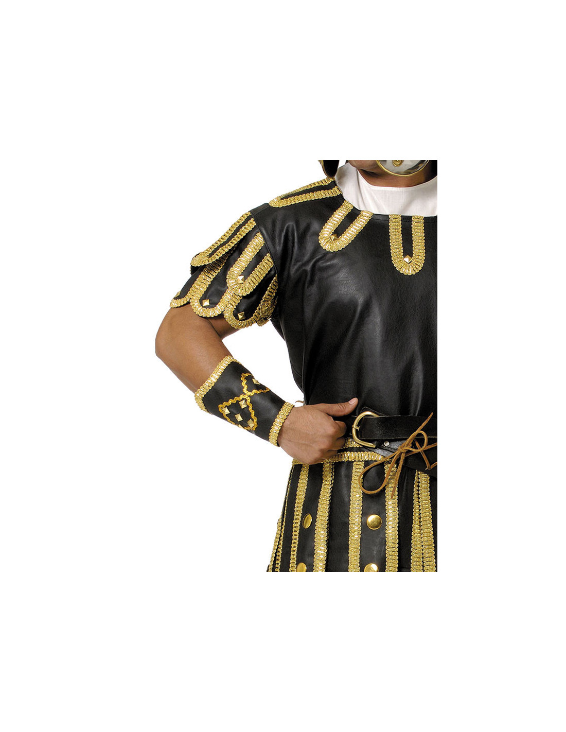 Disfraz de Centurión Romano compuesto por túnica blanca con detalle en los bajos de pasamanería verde, casaca de polipiel negra decorada con tiras de polipiel negra en el cuello, hombros y falda, decoradas con pasamanería y tachuelas de color oro. También incluye muñequeras y espinilleras de polipiel y decoradas con pasamanería y tachuelas color oro.