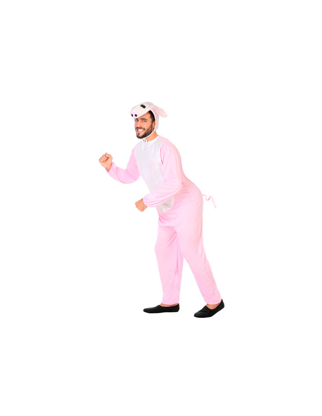 Disfraz cerdito adulto que incluye el mono con cabeza. El mono llega hasta el tobillo y se ajusta a él mediante un fruncido igual que en las mangas.