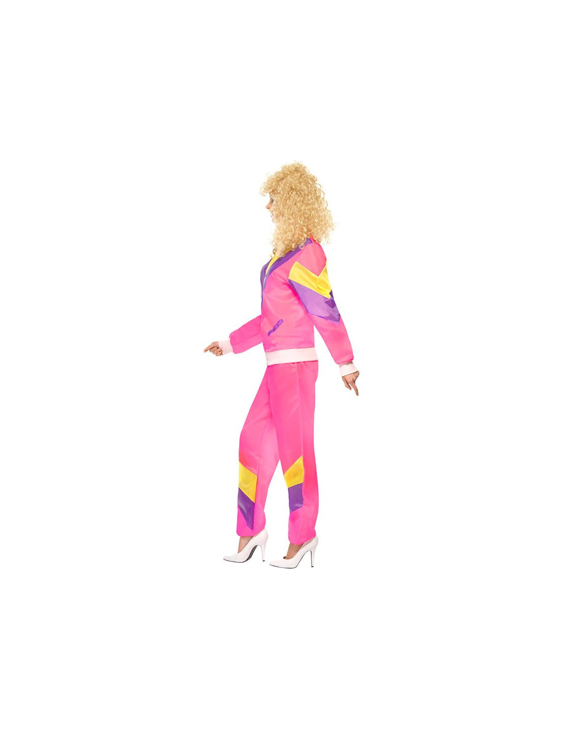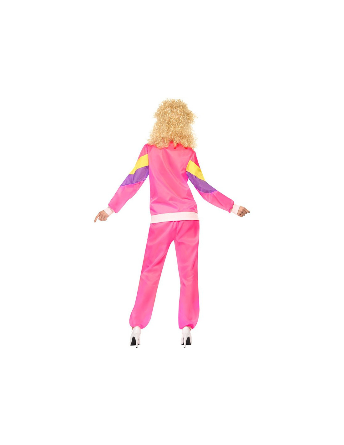El disfraz chándal retro mujer incluye chaqueta con cremallera y pantalones en tonos rosa, morado y amarillo.