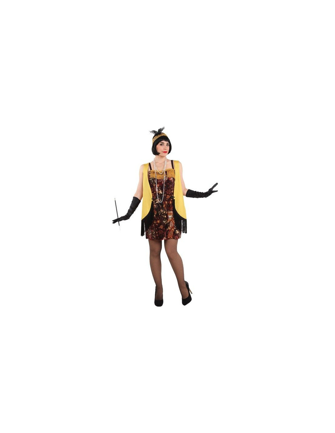 Disfraz Charleston, que incluye: Vestido estampado, con flecos en el escote, chaleco amarillo y tocado.