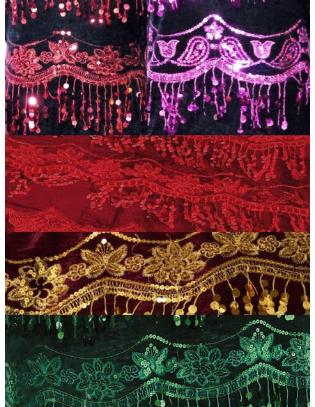 Disfraz de Chraleston incluye vestido de terciopelo con lentejuelas bordadas y tocado con pluma. Este disfraz esta disponible en varios colores