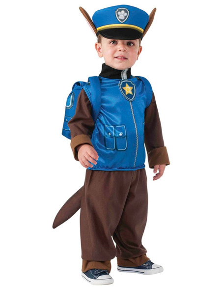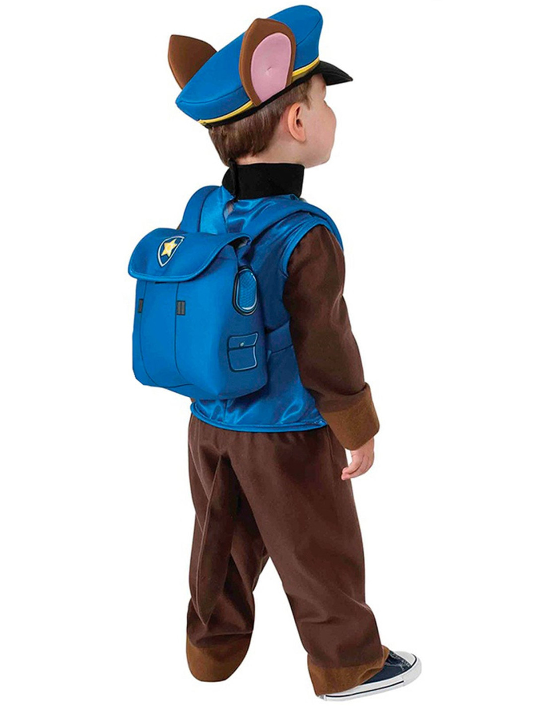 Disfraz Chase para que tu pequeño forme parte de su serie favorita La patrulla canina. Incluye un mono marrón con cola y un chaleco azul cosido al mono, una gorra azul con visera negra y ojeras marrones, y una mochila azul.