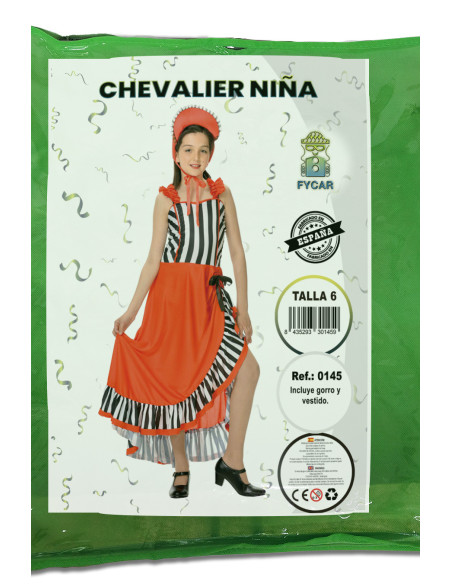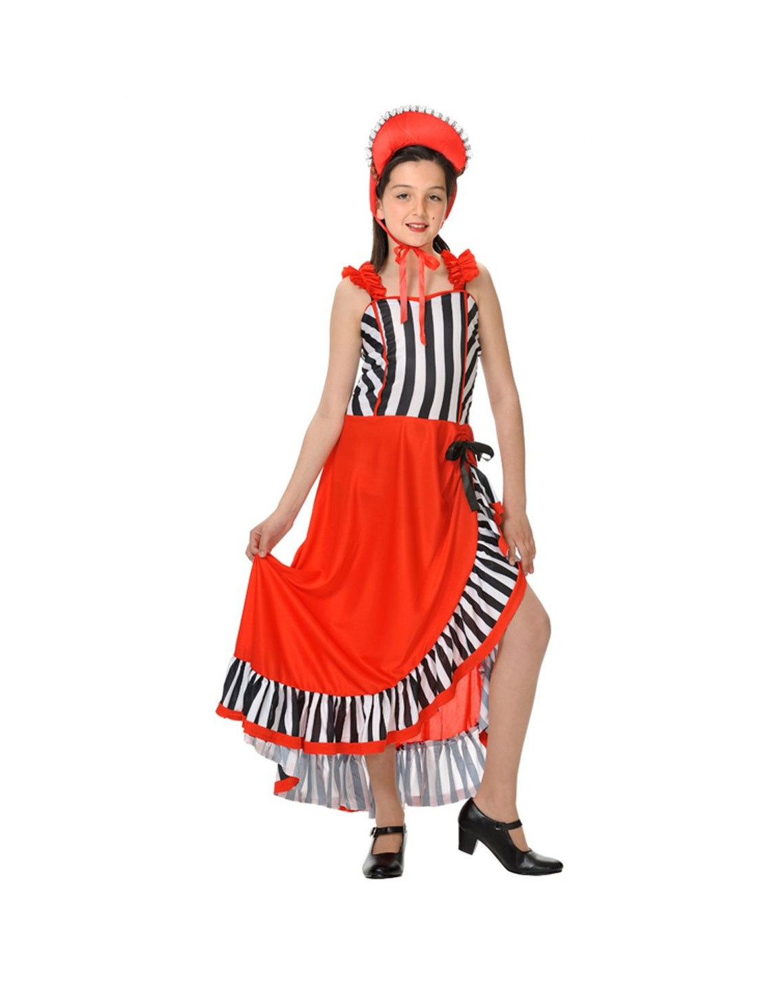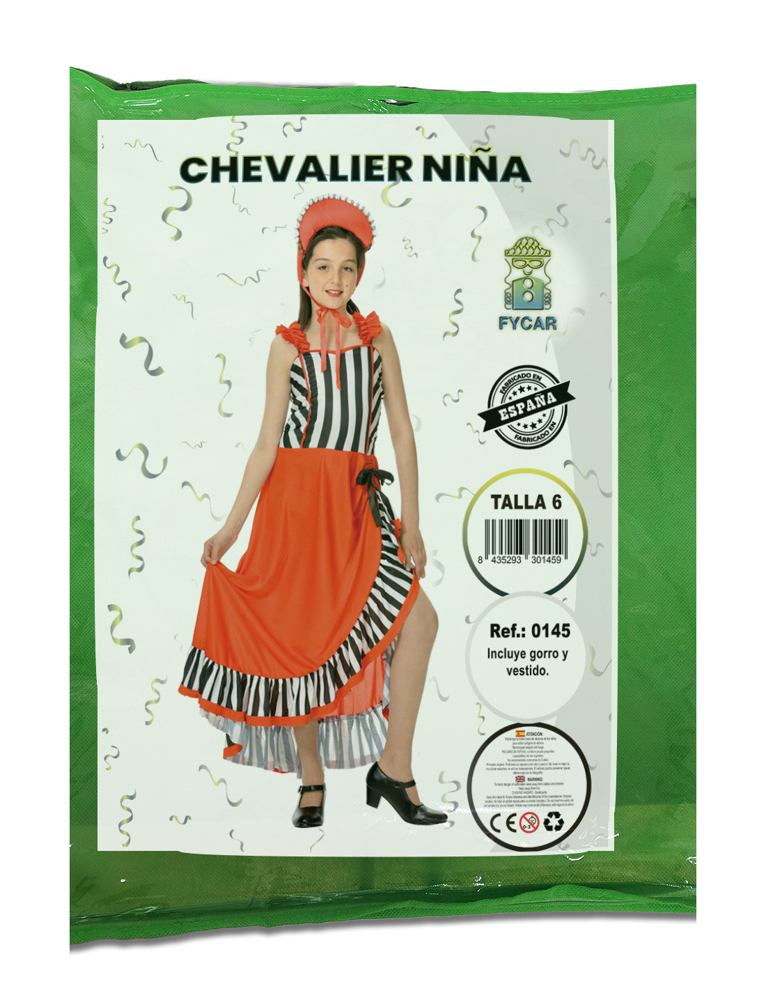 El traje incluye gorro y vestido todo en tejido de poliester decorado con estampacion, puedes utilizarlo para disfraz de cancan, de molin rouge o gondolera muy practico para festivales fin de curso.