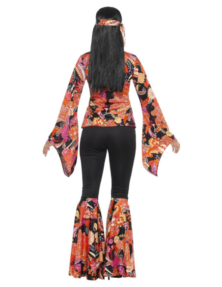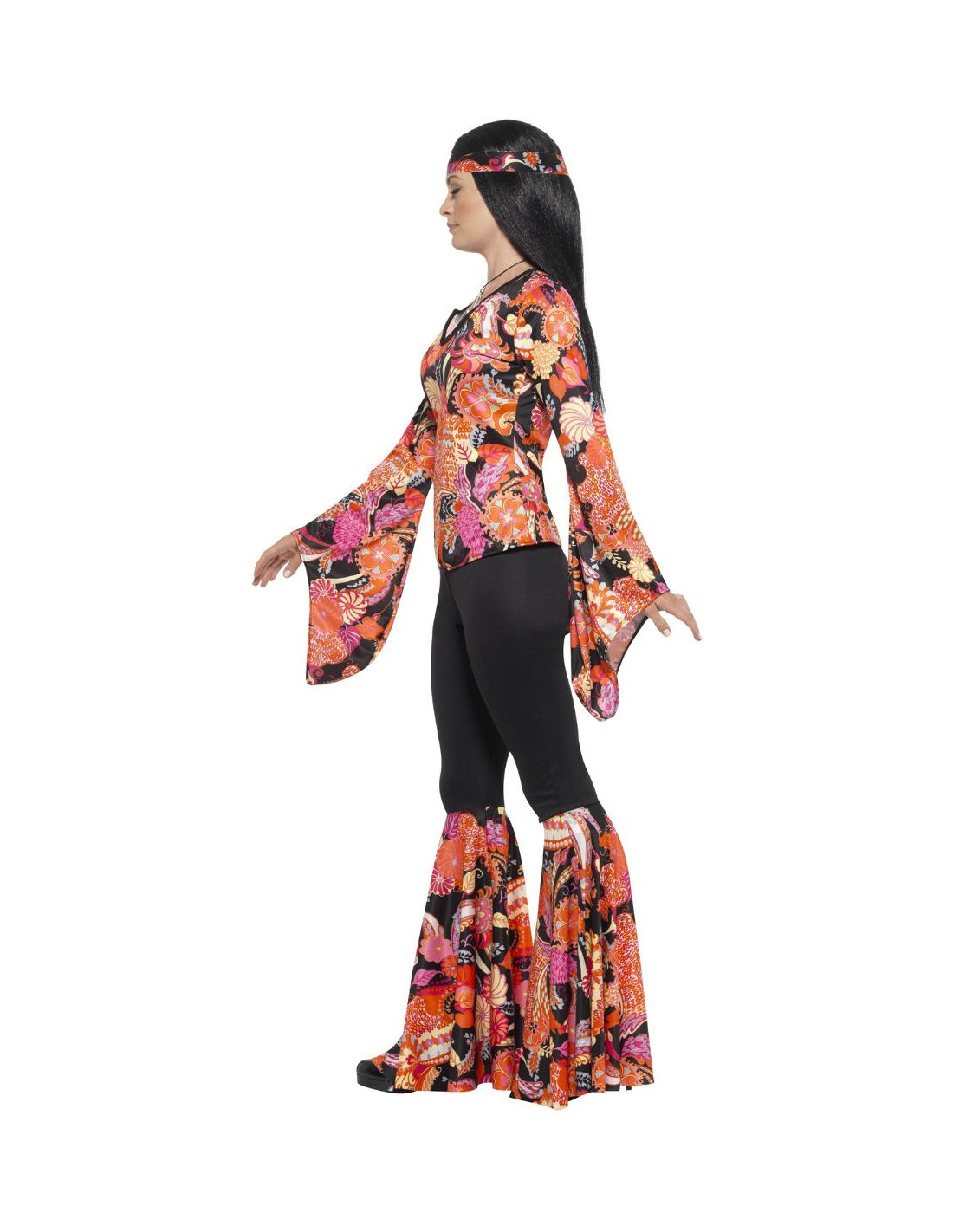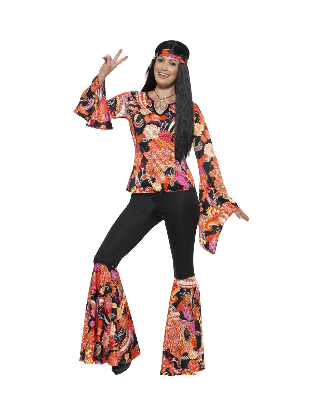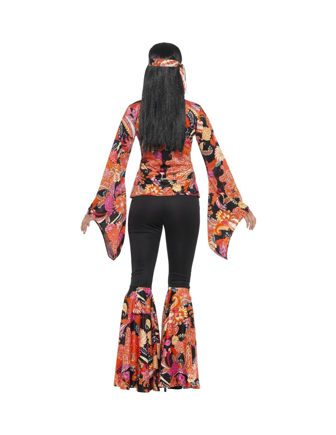 EL disfraz chica hippie para mujer contiene una camiseta estampada con anchas mangas, pantalón negro con campana estampada, pañuelo estampado y collar.