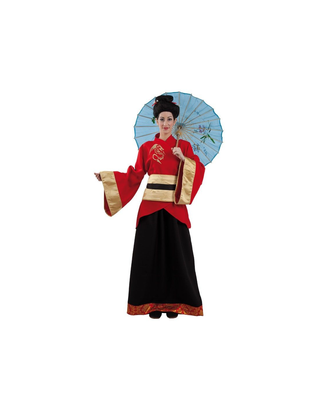 Disfraz china para mujer que incluye una chaqueta roja con un dragón estampado dorado, manga larga con los puños dorados, falda negra y cinturón dorado con una cinta negra.