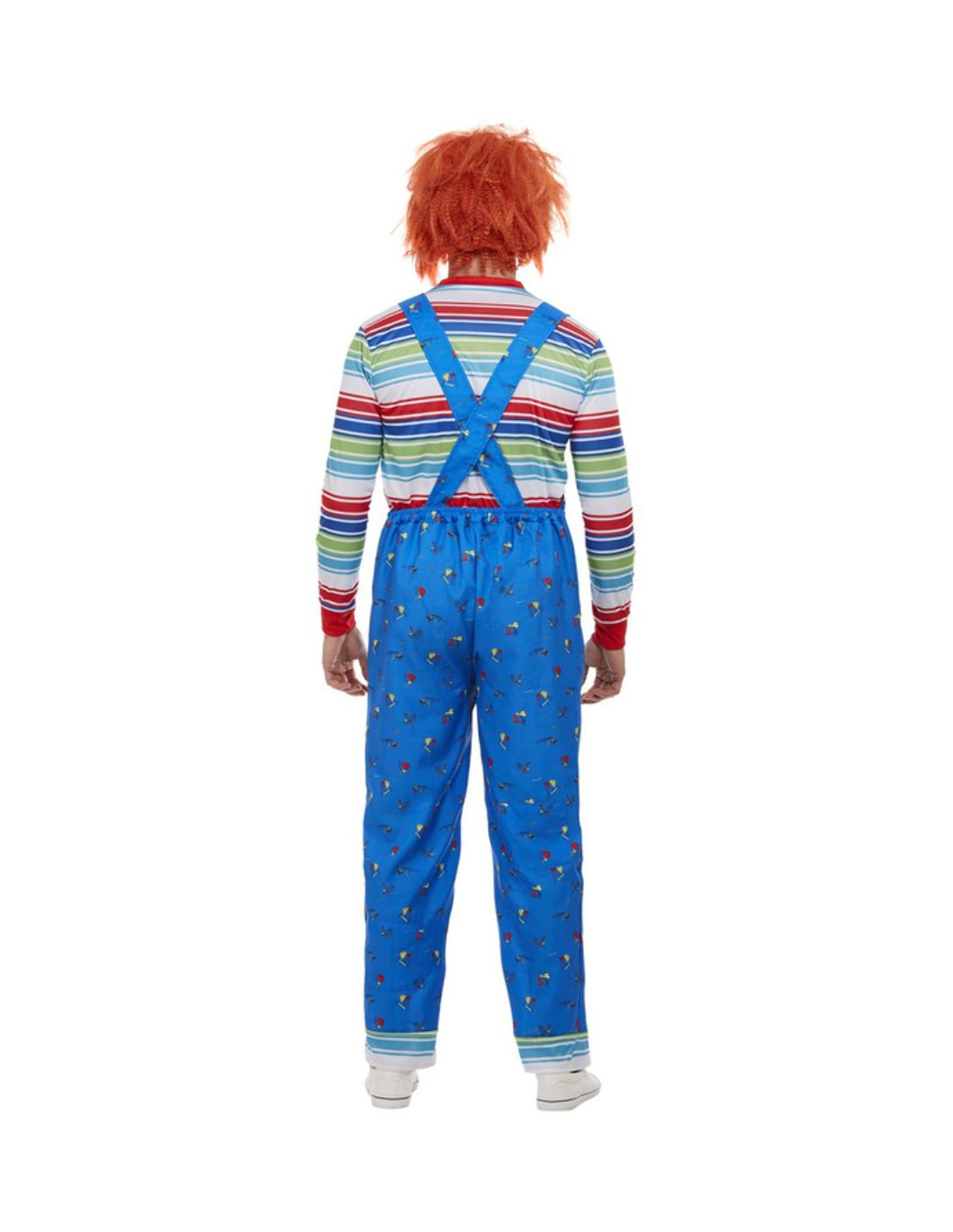 Este conjunto incluye un peto azul estampado, y una camiseta de rayas de colores. No incluye peluca. Puedes completar el look icónico de Chucky, con unos zapatos rojos, una peluca pelirroja y un cuchillo de plástico.