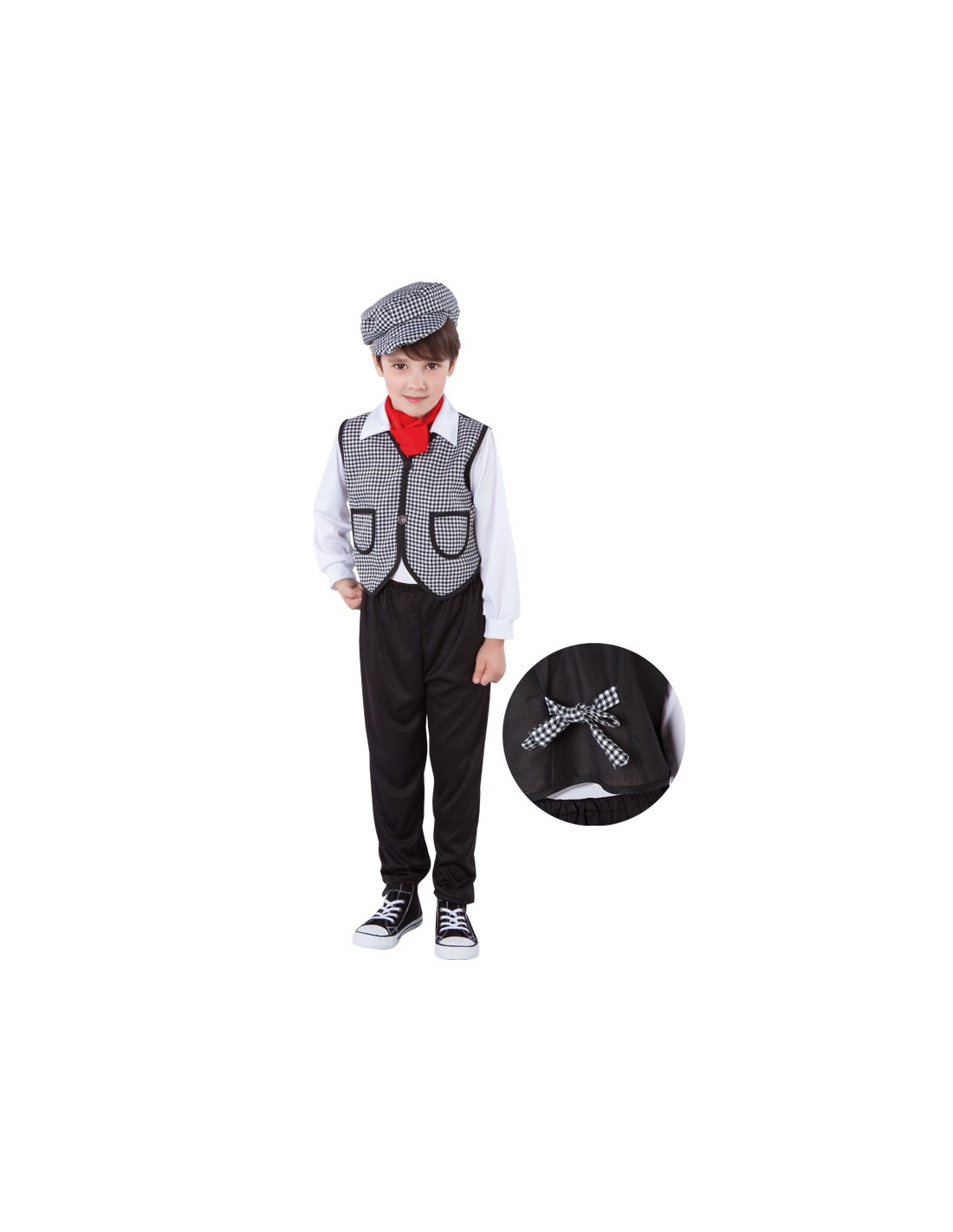 Este disfraz chulapo para niño incluye un chaleco con camisa, que tiene cuadros por delante y liso en la parte trasera, pañuelo rojo, pantalón negro con cintura elástica y gorra a cuadros.