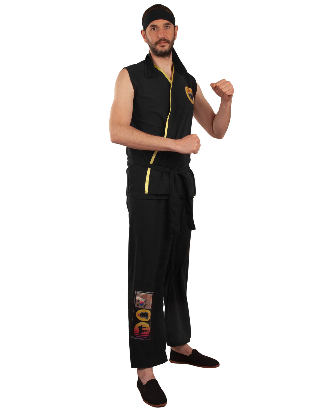 Disfraz Cobra Kai adulto que incluye casaca, pantalón, cinturón y cinta para la cabeza.