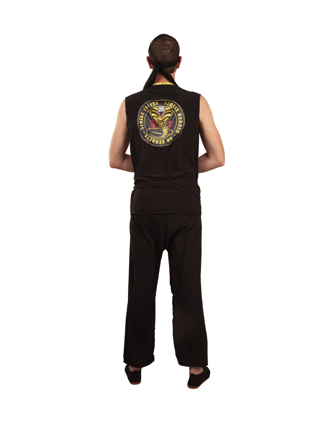 El disfraz Cobra Kai adulto contiene una camiseta abierta para colocar cruzada con un parche pequeño en el pecho y uno grande en la espalda, un cinturón de tela para sujetar la casaca, un pantalón con goma elástica en la cintura y parches en una de las piernas, y una cinta negra de tela para la cabeza.