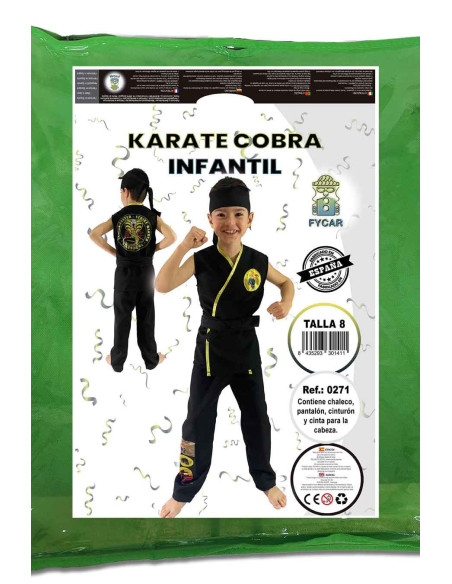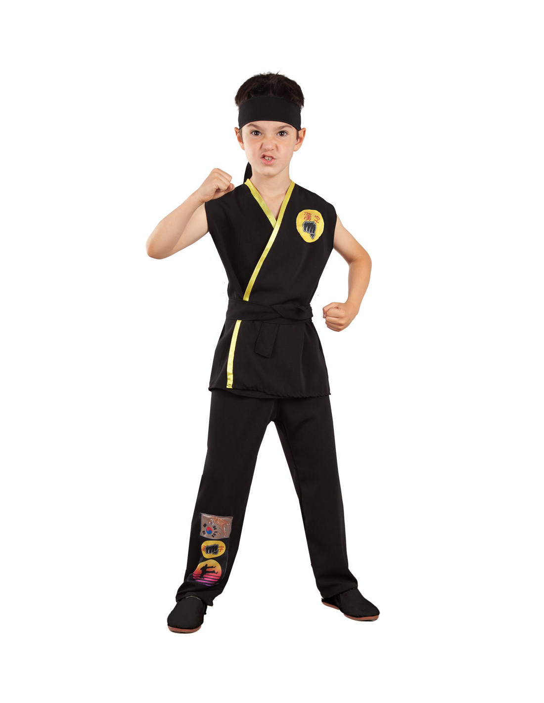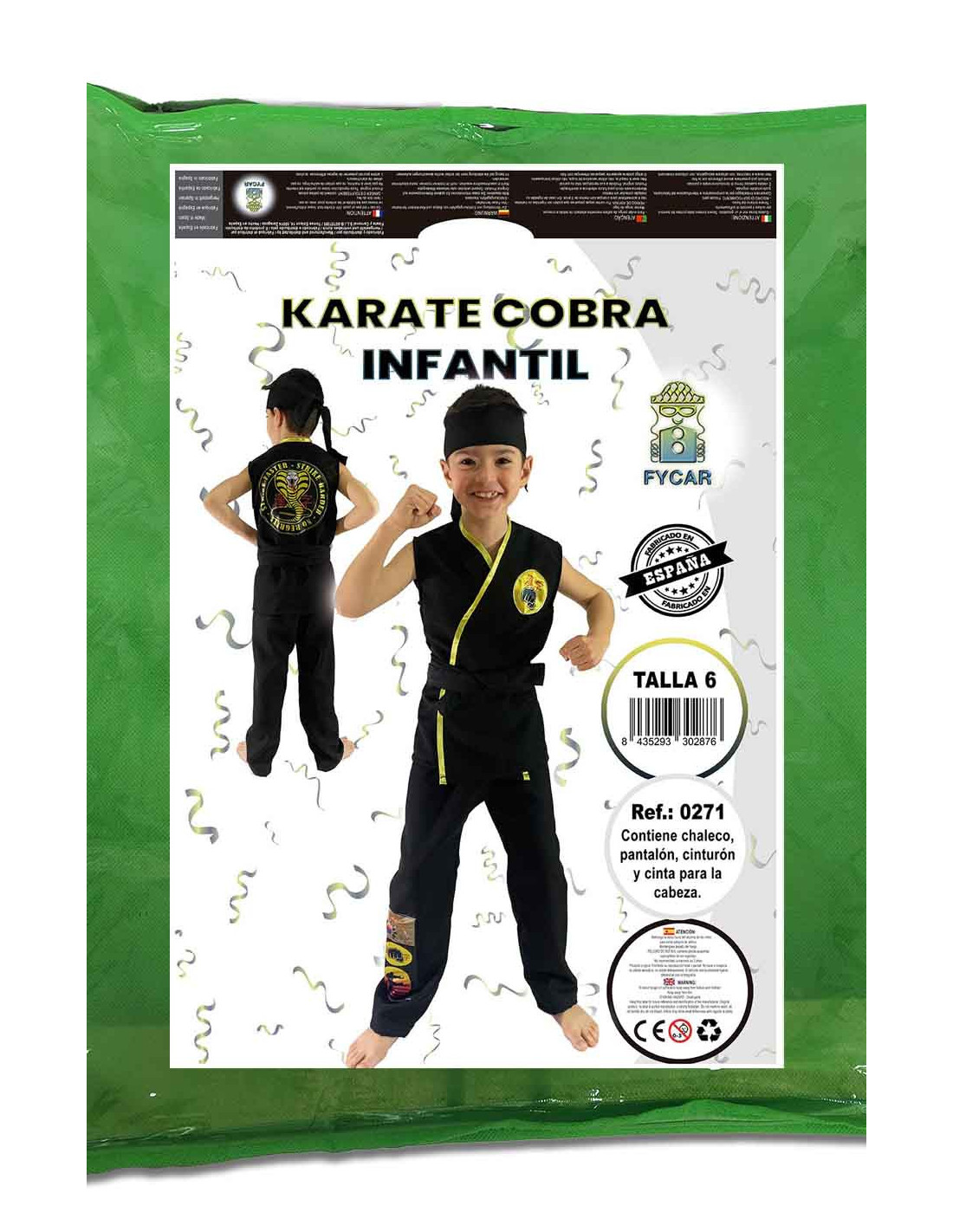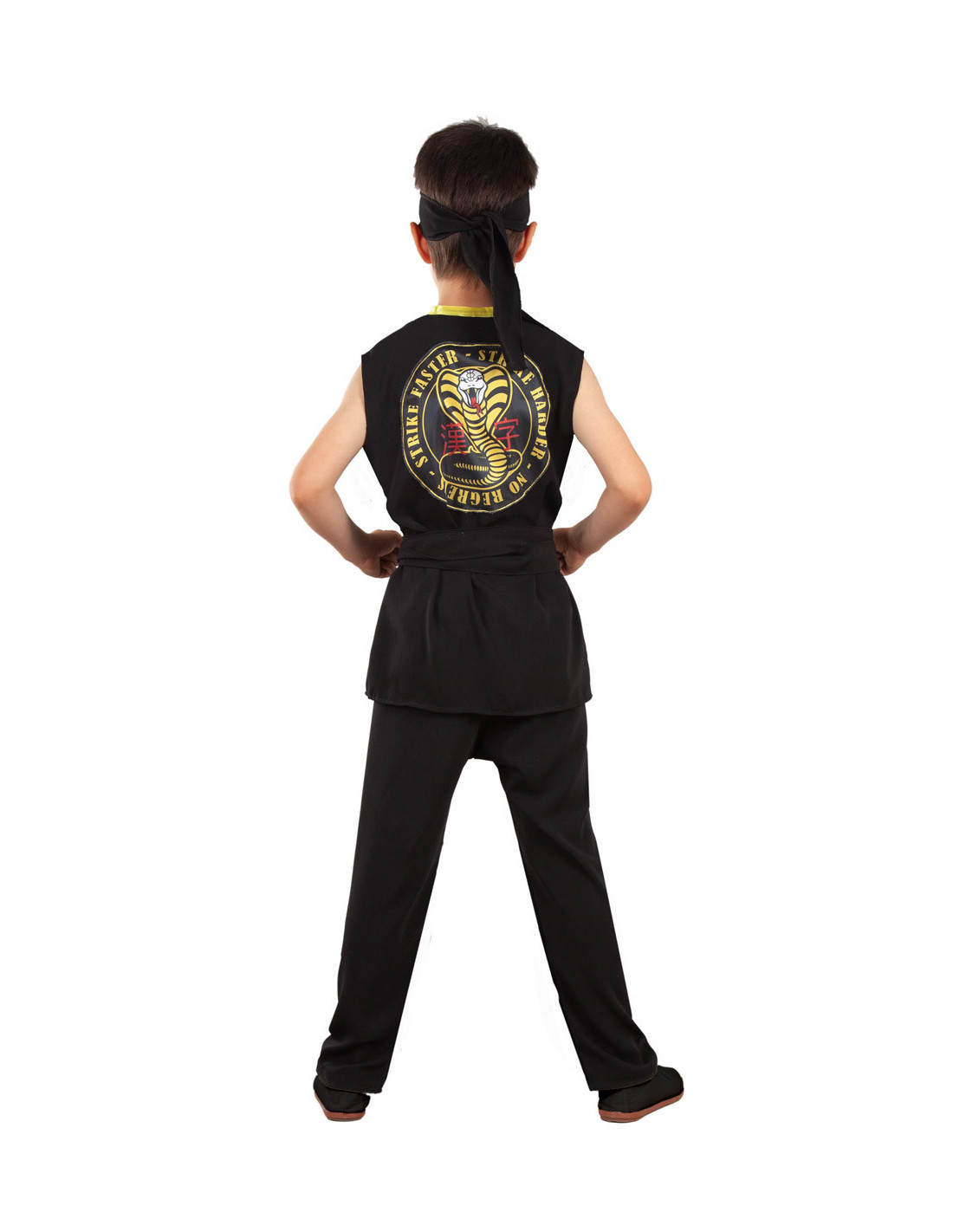 El disfraz Cobra Kai karateca infantil contiene un chaleco con parche en la perte frontal y en la espalda, cinturón negro, pantalón con parches en una de las piernas y cinta para la cabeza.