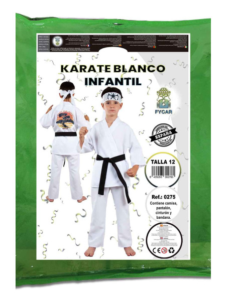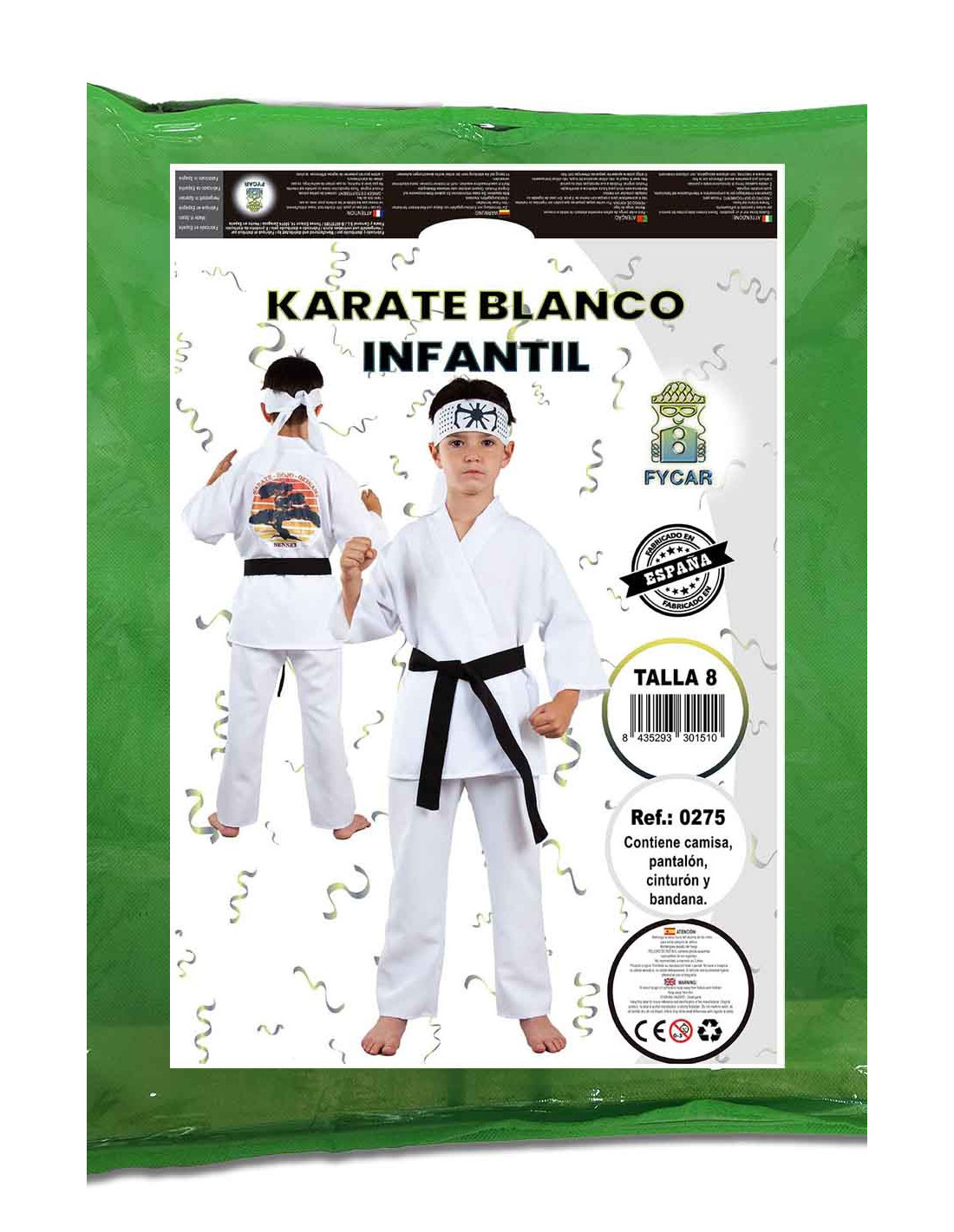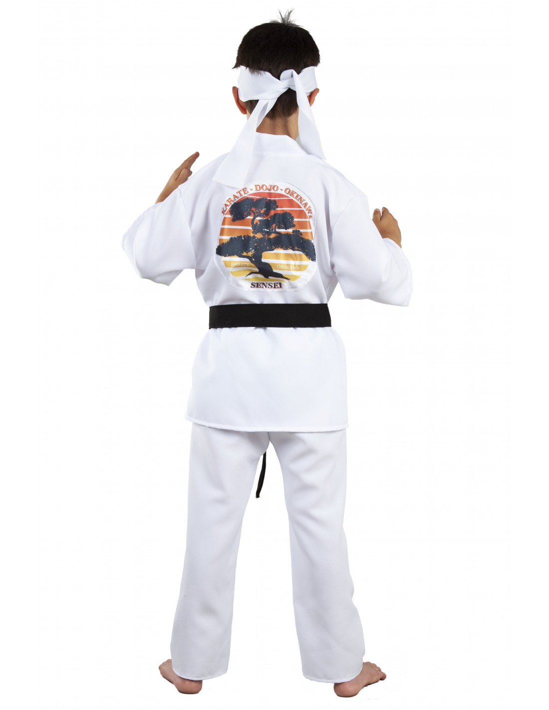El disfraz Cobra Kai karateka blanco contiene una cinta para el pelo, casaca con parche en la parte trasera, cinturón negro y pantalón blanco.