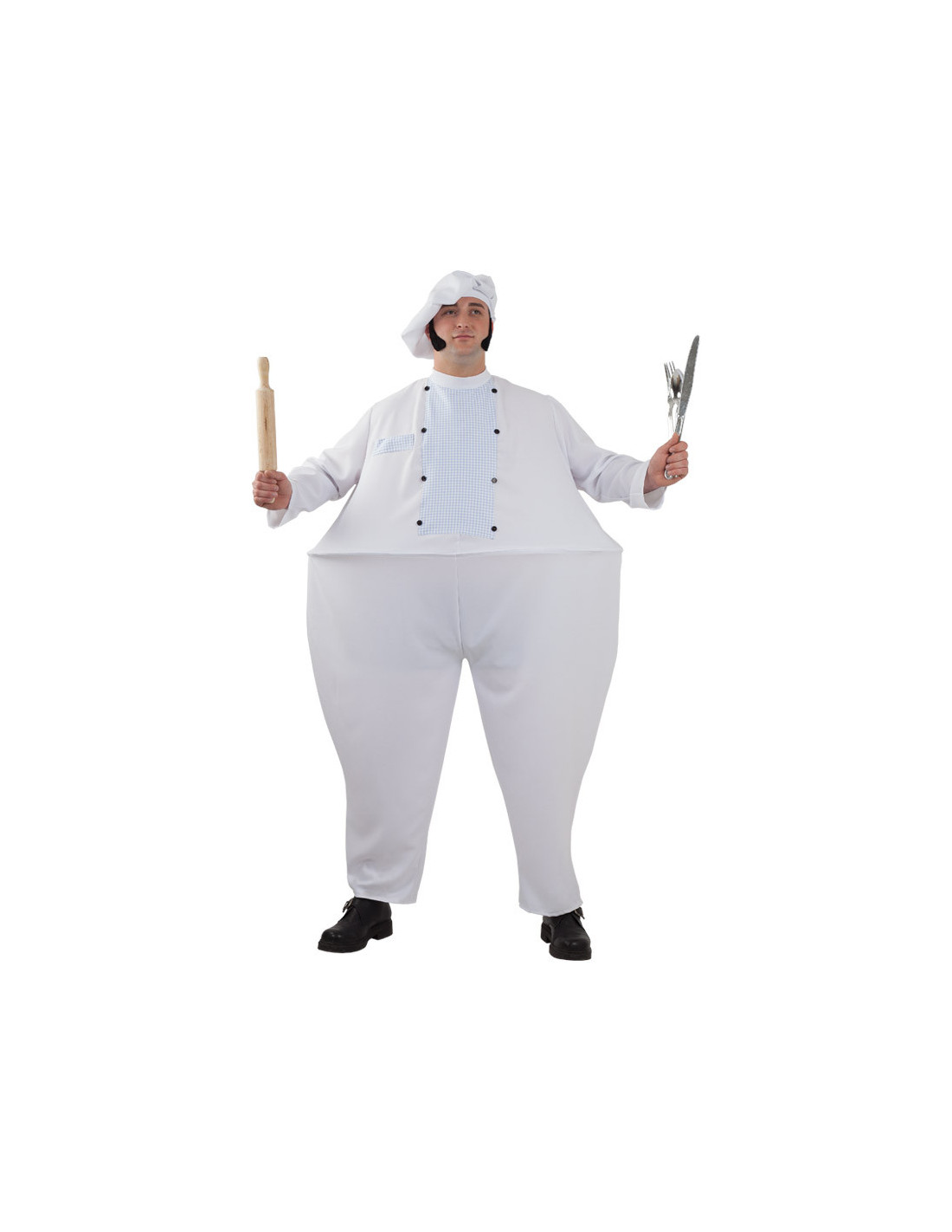 Disfraz cocinero gordo para desgustar cada uno de los platos que cocines y te conviertas en un MasterChef. Perfecto para fiestas temáticas y Carnaval. Incluye mono de cuerpo entero y gorro.